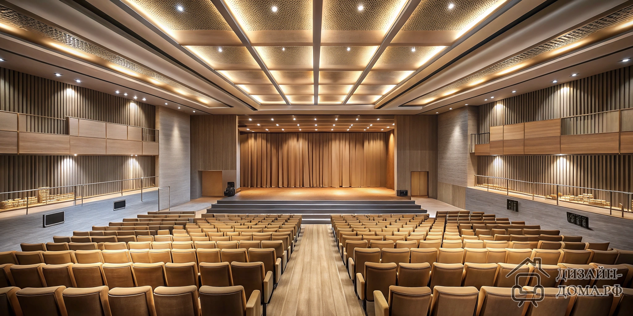 Такое оформление работает для залов любого масштаба — зрительский фокус остаётся на происходящем благодаря грамотной архитектуре пространства и акустическому оформлению.