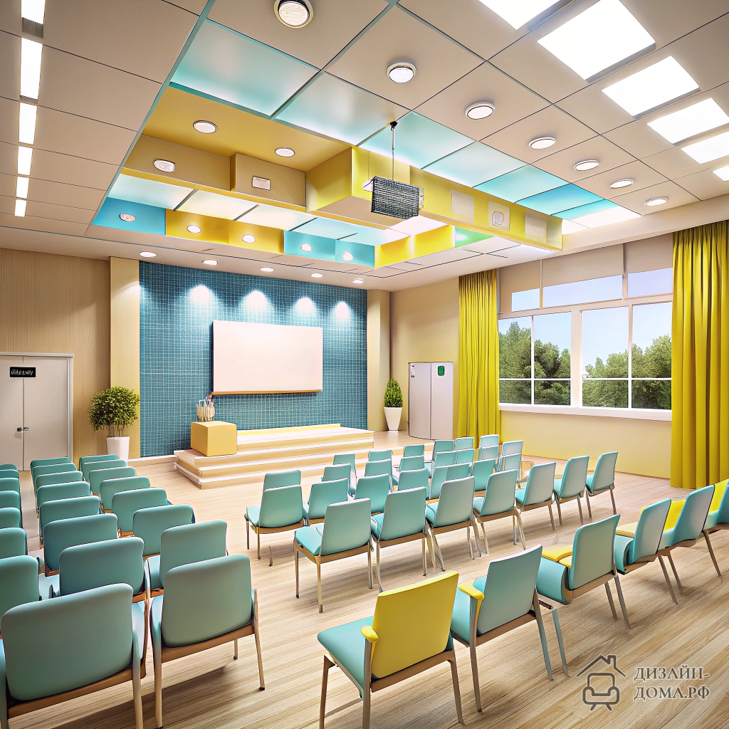 Совет для учебных или театральных залов: делайте посадочные зоны на разном уровне. На фото школы видно, как ступенчатые кресла с мягкими спинками гарантируют комфорт и обзор, а лёгкие портьеры формируют чёткие границы сцены.