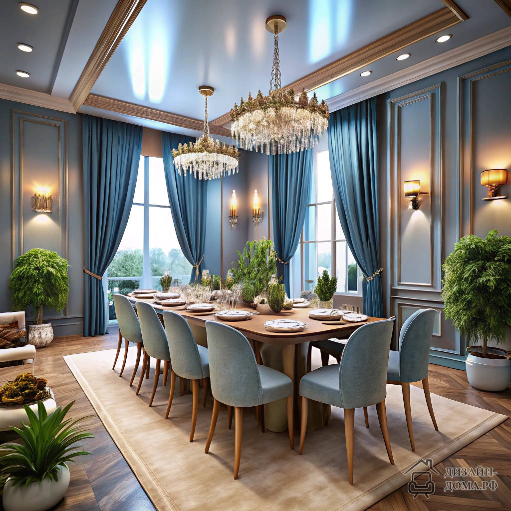 Не ограничивайтесь одной цветовой схемой: зал можно оживить сложными сочетаниями. Дизайнеры на примере современного ресторанно-банкетного зала обыграли сочетание мягкого синего (стены и бархатные шторы) с нейтральным бежем скатертей, бронзой светильников и живой зеленью на столах.