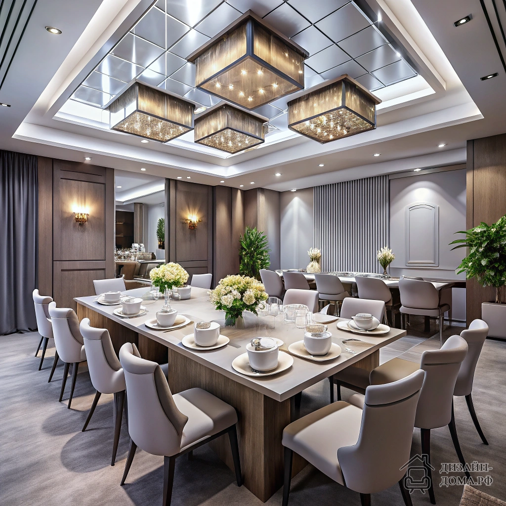 Лучший выбор: фигурная люстра или современный светильник в центре — это моментальный “афишный” эффект для интерьеров актового зала.