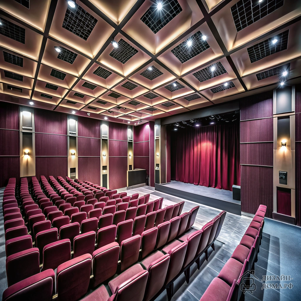 Правило для зрительных и театральных залов: дайте сцене чёткую рамку за счёт плотных, тёмных портьер и направленного света. На фото видно, как авторы интерьера комбинируют ярусную рассадку со звукоизолирующими панелями, а глубокий бордовый оттенок штор сразу выхватывает сцену из окружения.