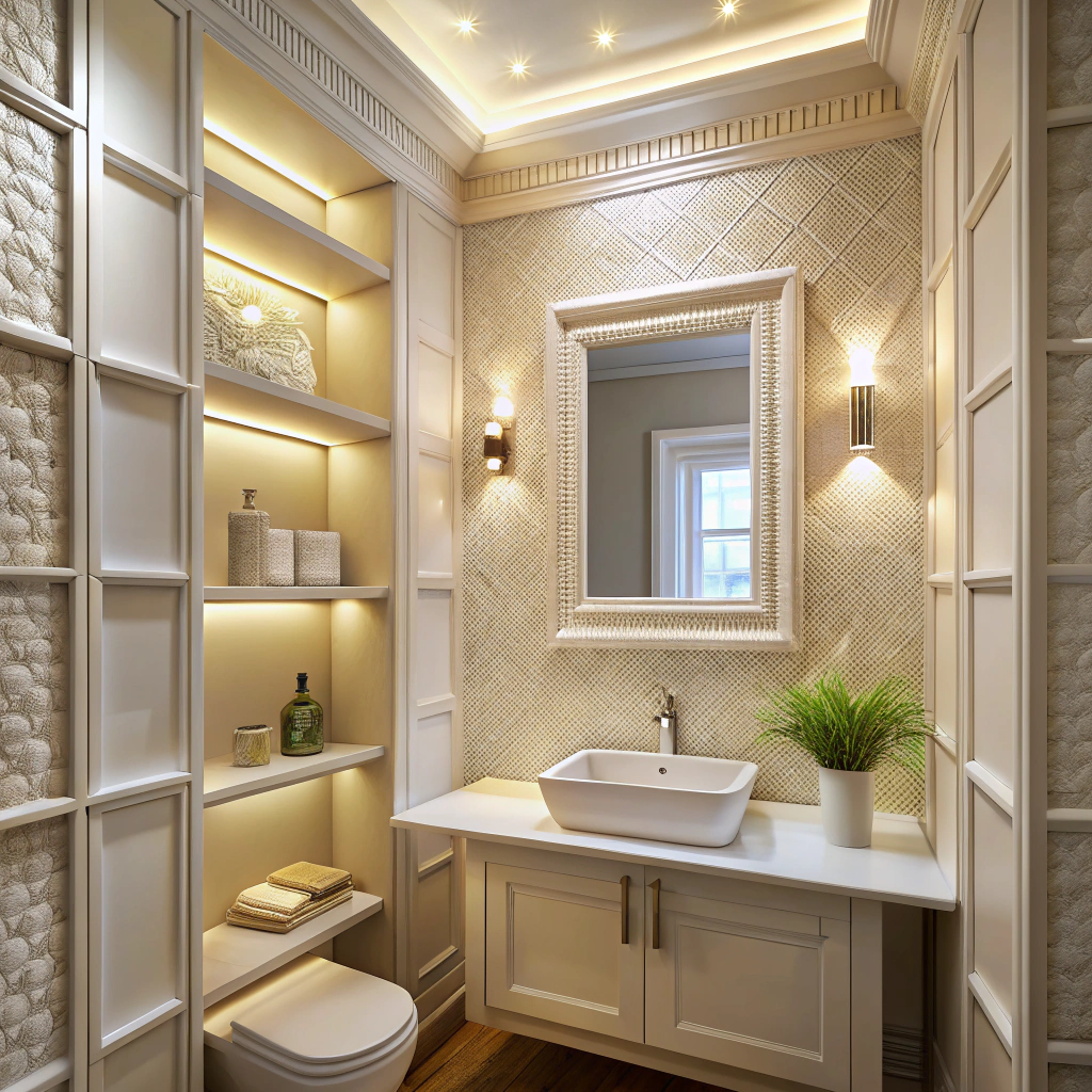 Малая ванная с декоративной гипсовой нишей над умывальником, внутри ниши подсветка и декоративные элементы, белая плитка с текстурой, аккуратные молдинги на потолке, практичная система хранения.