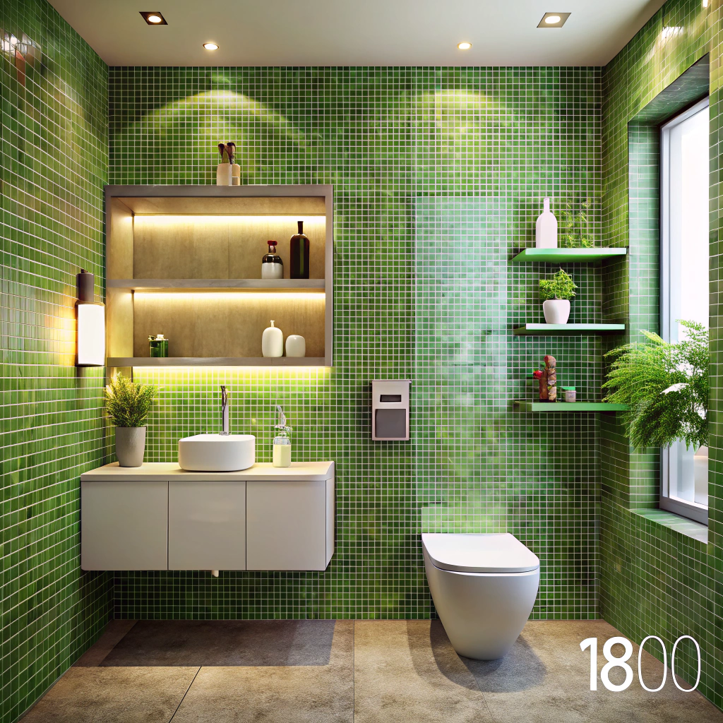 Ванная 180×180 с акцентной стеной из зелёной глянцевой мозаики 15×15 мм, минималистичная белая сантехника, подвесная полка, металлический аксессуар и точечное освещение, показывающее блеск мозаики.