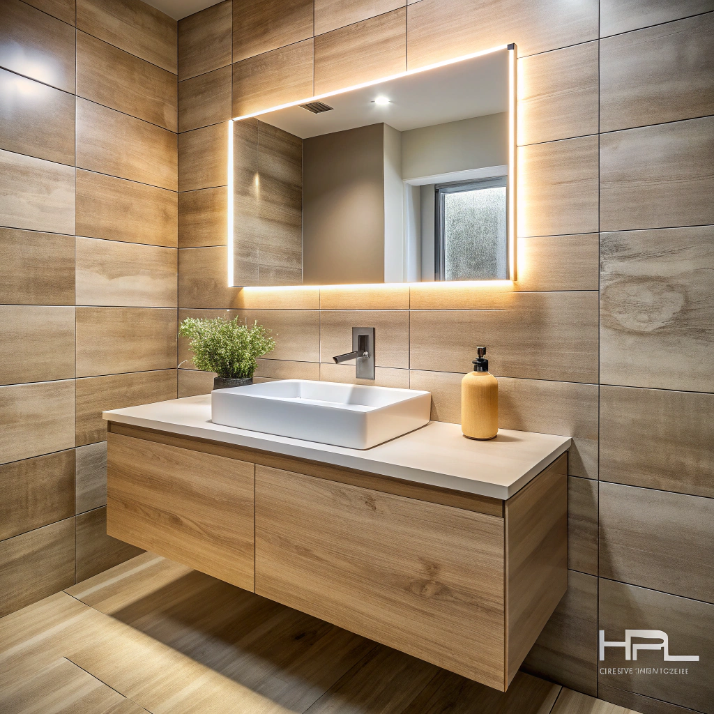 Крупный план тумбы под раковину из HPL: текстура 'светлое дерево', скрытые ручки, влагозащитные кромки, над тумбой зеркало и настенное освещение. Виден контраст с плиткой и расположение сантехники.