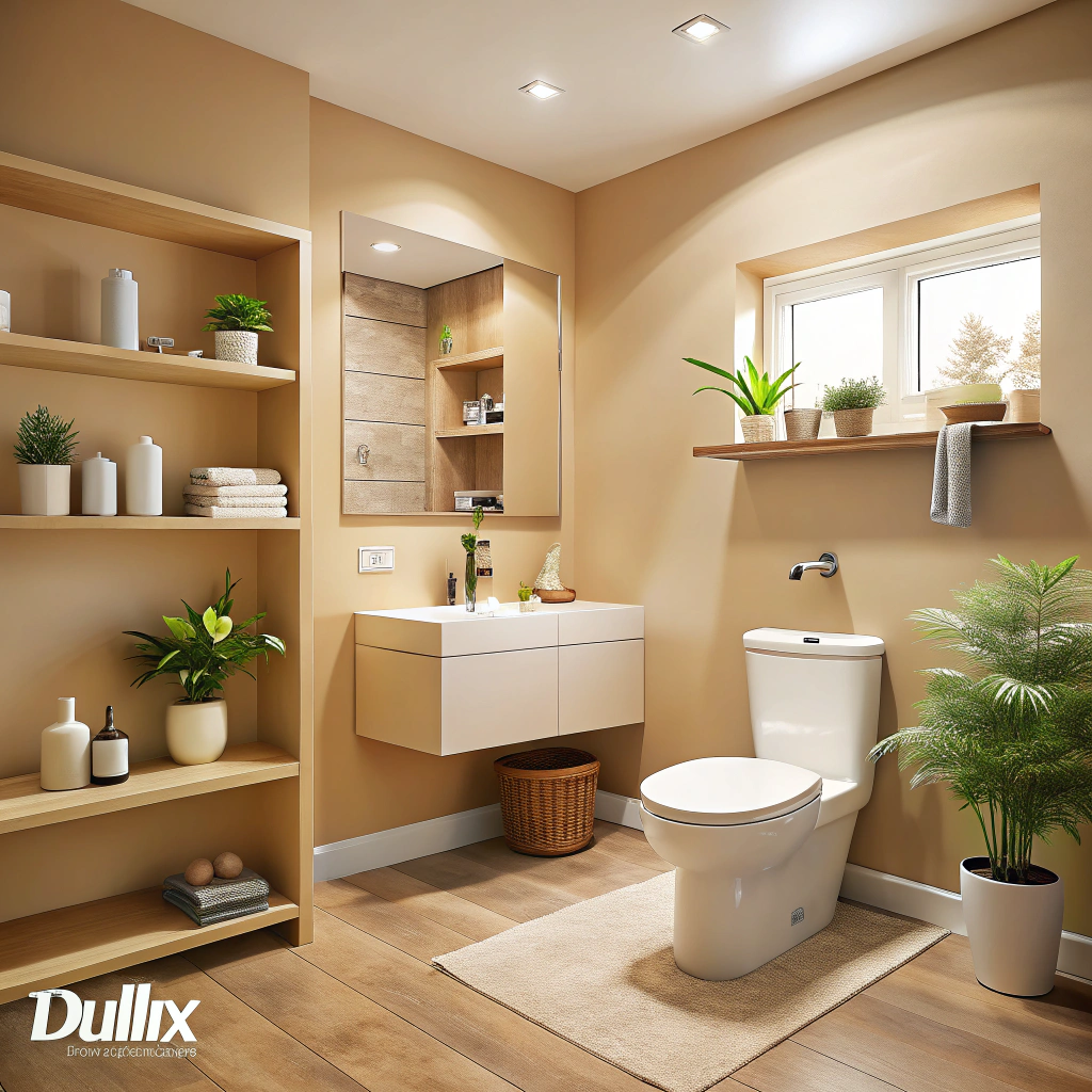 Малая ванная в тёплых бежевых оттенках: стены окрашены подходящим номером Dulux, светлая плитка на полу, белая мебель, деревянная полка, растения в горшках и тёплое рассеянное освещение. Демонстрация контраста с белой сантехникой.