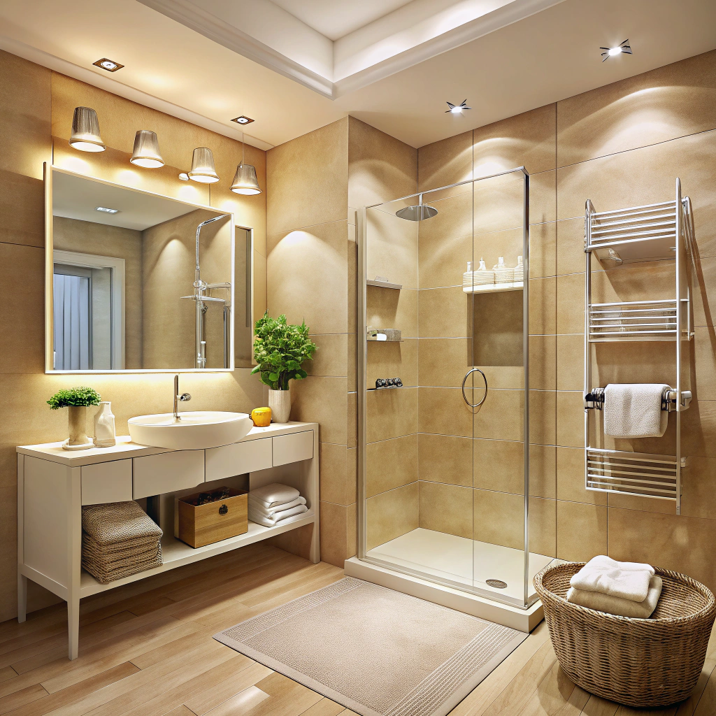 Правило от дизайнеров: бежевый на стенах и минимум визуальных перегородок. В проекте стены выкрасили в светлый оттенок S 1002 Y50R, поставили стеклянную перегородку для душа и только базовую мебель и корзины — никаких ярких линий и громоздких шкафов. Потолочные светильники и встроенный полотенцесушитель завершают единый образ. Тёплый пол вкупе с продуманным освещением создаёт ощущение, что ванная чуть больше, чем есть.