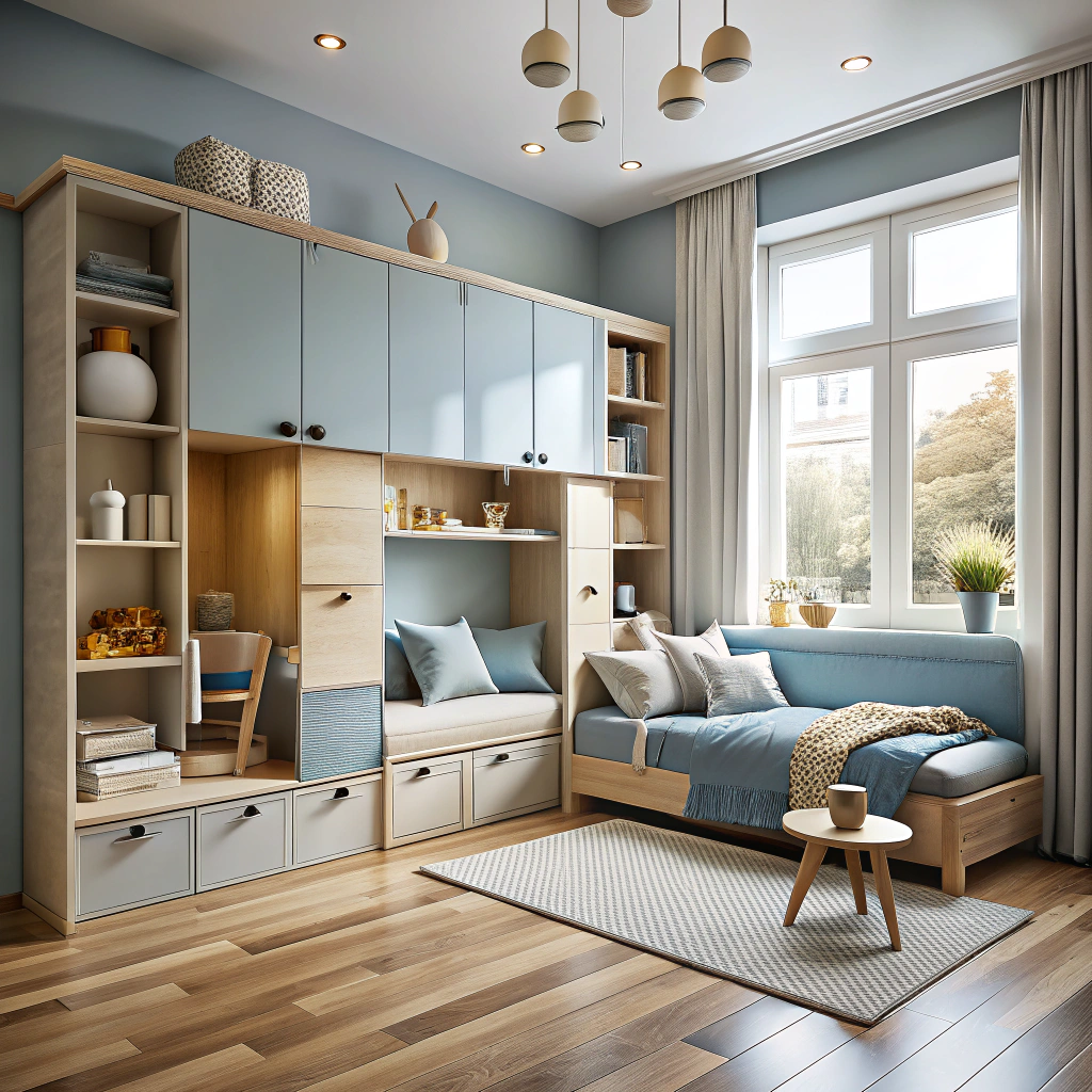 Главный принцип: не только встроенные шкафы. Здесь дизайнер применил микс — и закрытых систем (под кроватью, в скамье-подоконнике), и открытых (полки для книг и любимых игрушек). Зоны чётко выделены: слева место для сна с низкой кроватью и мягкими подушками, справа — набор коробов для игровых мелочей, в центре остаётся свободное поле для игр. Акценты выдержаны в голубых и нейтральных тонах. Такое решение позволяет не только легче поддерживать порядок — ребёнок сам может убирать свои вещи — но и визуально не загружает комнату.