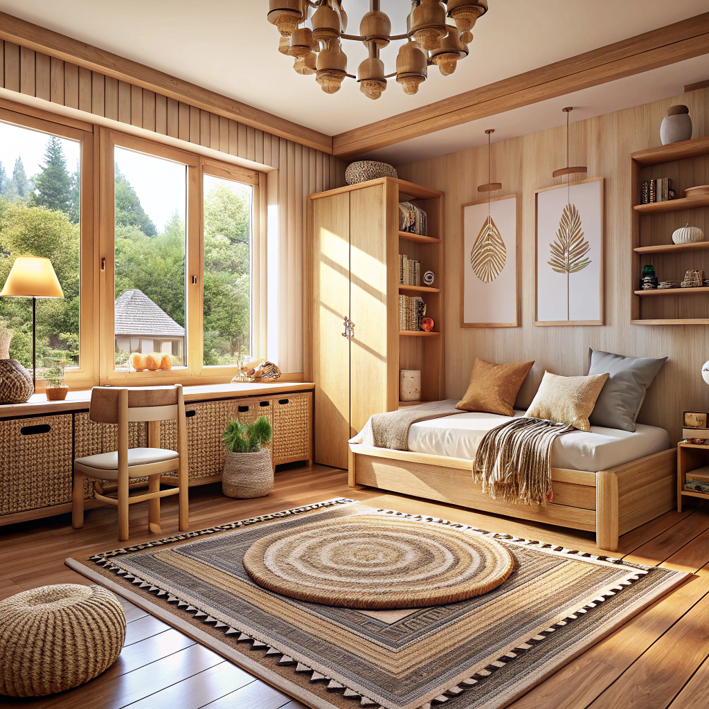 Пол в духе бохо — это не только про моду, но и про тактильный комфорт. Главное — выразительные древесные текстуры, крупный ковёр с этническими или геометрическими узорами и минимум глянца на мебели. На фото видны светлый тёплый пол, низкая мебель (удобная и для малышей, и для младших школьников), много натуральных тканей. Изюминка — плетёный декор, который органично сочетается и с современным, и с эко-стилем. Мягкий свет из окон не «теряется»: пол выступает основой для разных сценариев — зона игр легко превращается в место для встреч с друзьями или даже небольшой спортивный уголок.