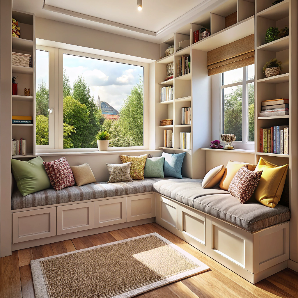 Правило первое: используйте геометрию помещения — объедините два окна одной зоной и получите уникальное место для игр, отдыха и уединения. На фотографии видно, как дизайнер грамотно превращает угловое окно в полноценный архитектурный элемент. Скамья-подоконник встроена прямо под окнами и украшена разноцветными подушками, а под ней — системы для хранения игрушек и книг. Над скамьёй открытые полки берут на себя роль «витрины» для любимых книг и поделок. Мягкий коврик на полу смягчает визуальное впечатление и зовёт прилечь, а живые акценты текстиля добавляют комнате уюта.