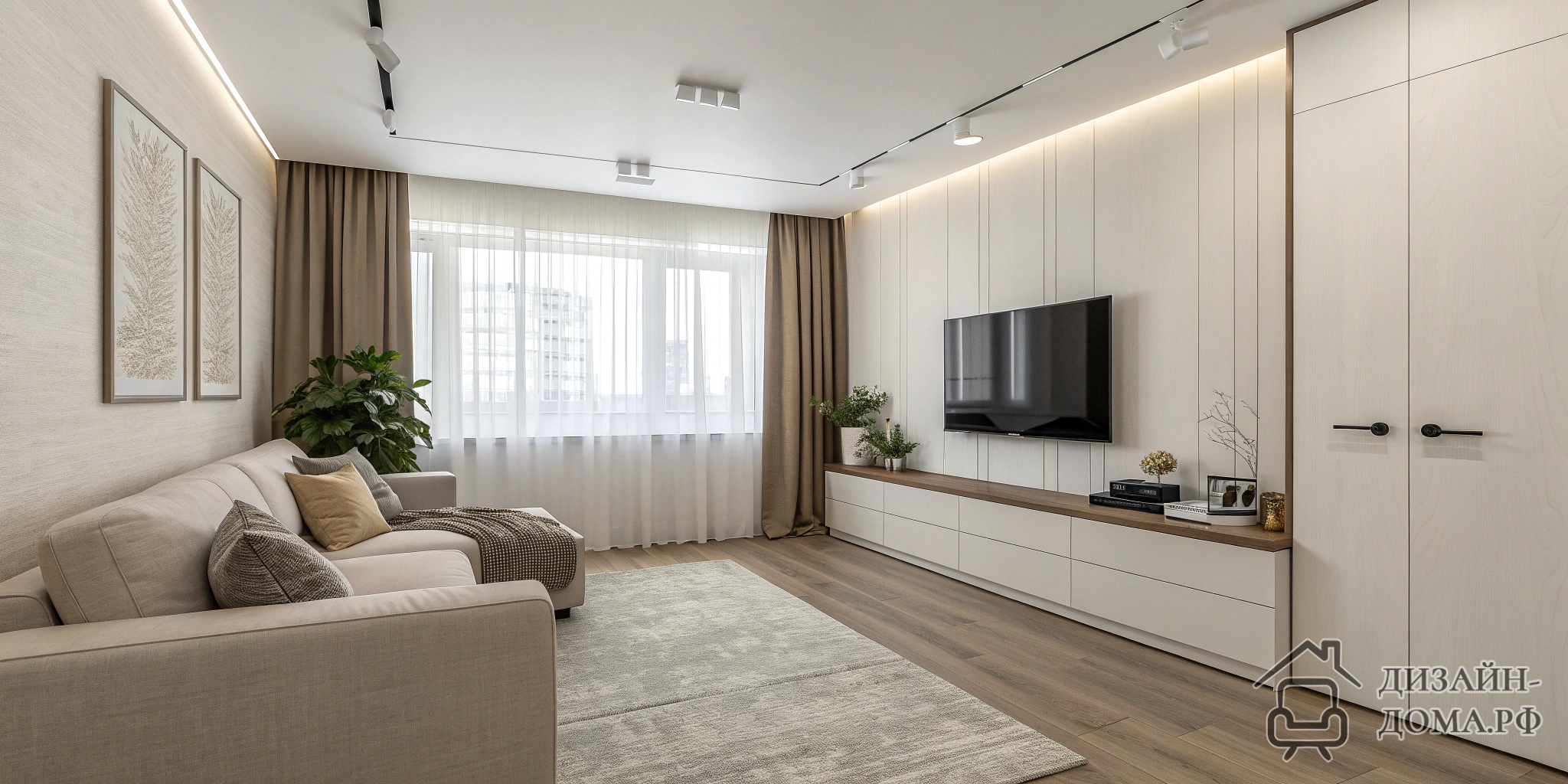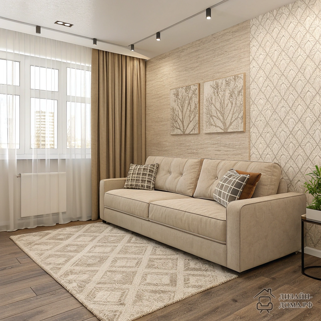Чтобы даже небольшой зал казался уютным и продуманным, скомбинируйте несколько нейтральных, но разных по фактуре материалов: как в проекте — мягкая бархатистая обивка дивана, плотные молочные шторы, текстурные обои на акцентной стене и комфортный бежевый ламинат. Такое сочетание смотрится богато и приглушает чувство монотонности даже при минимальной цветовой гамме. Работа с материалами — тонкая игра света и тени.