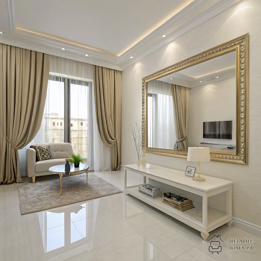 Одна из самых частых проблем: гостиная с одним окном не получает достаточно естественного света. Но если брать за основу молочные стены и добавить зеркало напротив окна — результат может быть впечатляющим. Дизайнеры в примере добились лёгкости за счёт лаконичных бежевых штор, глянцевого белого столика и светлого ламината, а зеркало стало центром композиции. Свет не уходит — он словно умножается, отражаясь и заливая комнату полностью.
