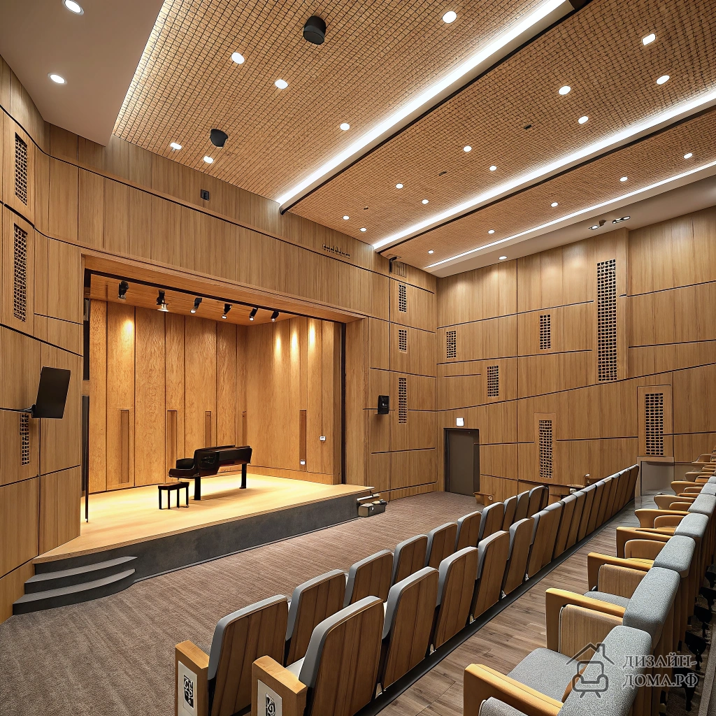 Вопрос, который часто игнорируют при проектировании: как совместить сцену, акустику и комфорт для зрителей? Авторы этого интерьера сделали ставку на материалы и детали: тёплые деревянные панели на стенах гасят эхо, акустические элементы создают направленный звук, а кресла расположены так, что сцена видна из любого ряда. Мягкое регулируемое освещение дополняет картину, делая пространство универсальным — для концерта, лекции или школьного спектакля.