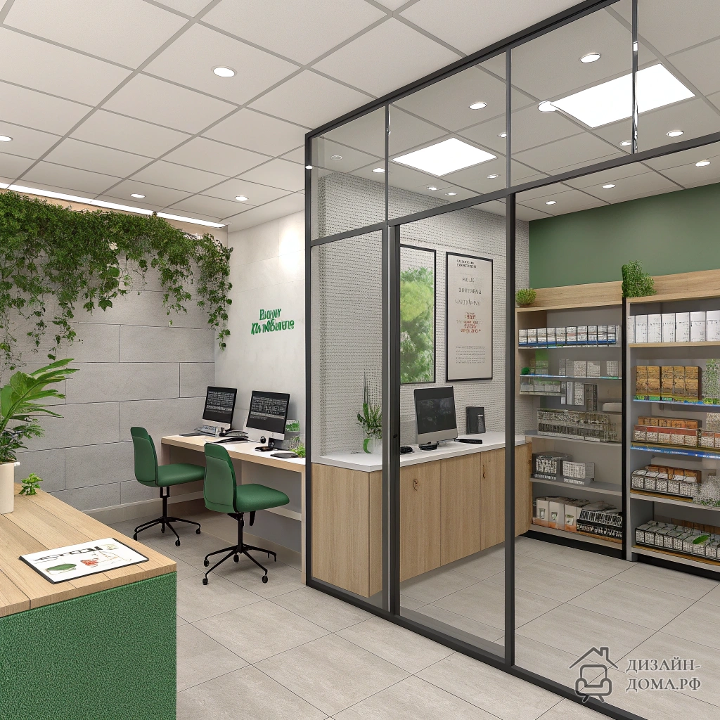Перед авторами служебной зоны стояла парадоксальная задача: офис магазина должен быть одновременно приватным и максимально открытым для визуального контроля. Решение — прозрачная стеклянная перегородка, делающая микропространство частью торгового зала, но защищающая рабочее место от шумовой атаки. Здесь нет глухих стен: именно стекло объединяет функции контроля и комфорта. Рабочие столы развернуты к витрине, открытые стеллажи с товаром служат и хранилищем, и лёгким акцентом атмосферы. На полке можно заметить зелёные растения в кашпо — это штрих, который делает даже сугубо административное пространство уютным.