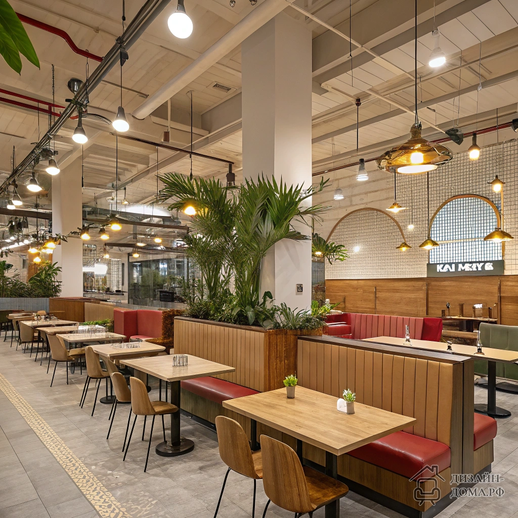 Что первым бросается в глаза на фото современного фудкорта? Это не просто столовая, а пространство с разным ритмом: кому-то здесь удобно перекусить в одиночку за высоким столом, кто-то приходит компанией и попадает в полукресло «кабинки». Дизайнер подходил к зонированию как к режиссуре: деревянные столы и мягкие кресла на тонких ножках чередуются с металлическими элементами, а массовая высадка крупных растений расставляет визуальные акценты. Подвесные светильники объединяют группы по интересам, создавая камерные зоны в открытом пространстве. Благодаря тёплой нейтральной палитре шум торгового центра смягчается, а интерьер буквально приглашает задержаться подольше.