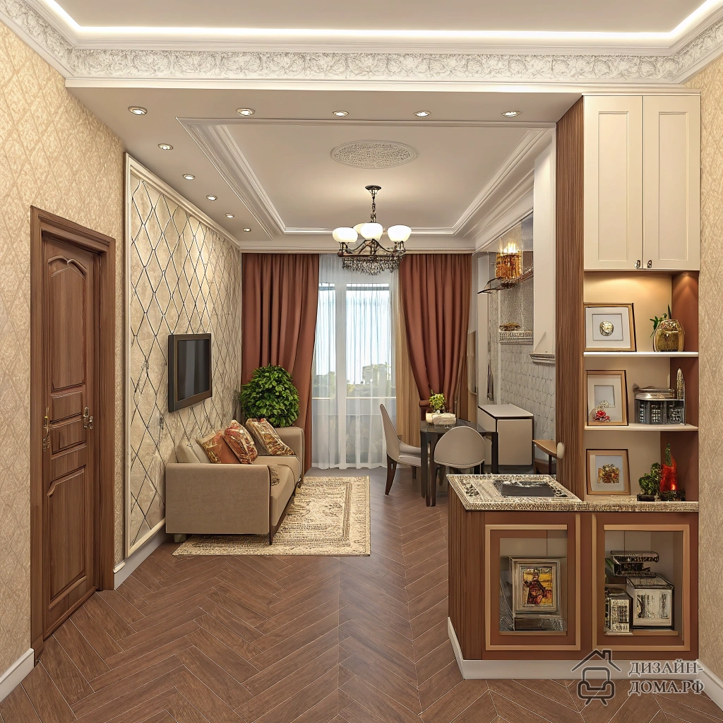 Главное в ремонте — не смешивать всё подряд без системы. Здесь есть открытая планировка, единый тёплый коричневый пол, светлая отделка потолков, текстиль — всё поддерживает одну палитру. Пространство зонируется плавно: зона отдыха незаметно переходит в столовую, а окна обрамлены мягкими шторами. Деталь: декоративная раскладка на потолке «перекликается» с рисунком мебели и ткани. Такой подход моментально «собирает» квартиру, даже если бюджет был минимален.