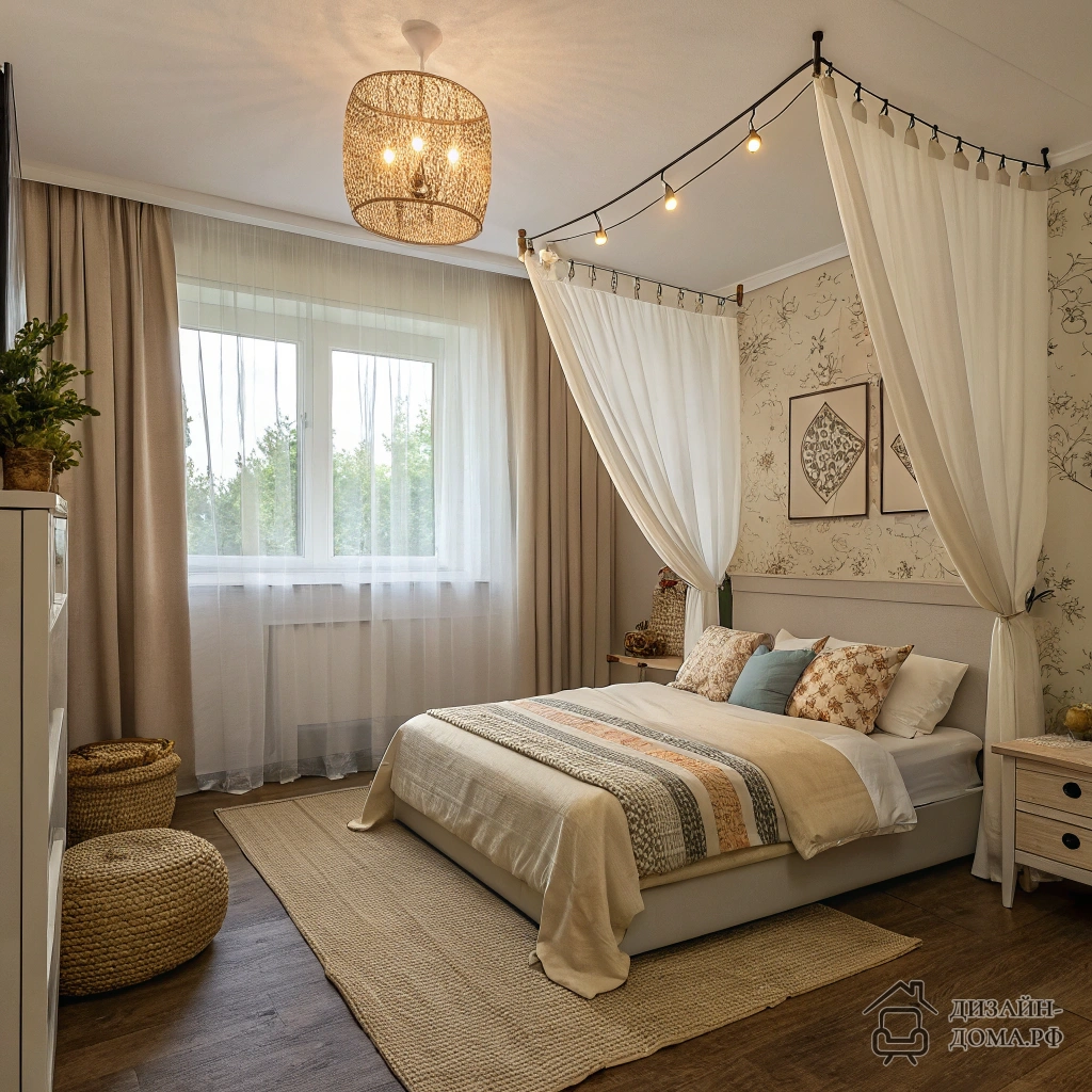 Если светлой комнате не хватает уюта, двойной слой штор — одно из лучших решений. Здесь дизайнер использовал многослойные лёгкие ткани (тюль плюс плотные шторы), цветовая гамма осталась тёплой, а сама кровать «тонет» в мягких подушках. Интересная деталь: занавеси гармонируют с коричневым полом и не затмевают дневной свет, а текстильные акценты повторяются в деталях — пледах, декоративных подушках, ковре. Помещение сразу кажется обжитым, мягким, расслабляющим.