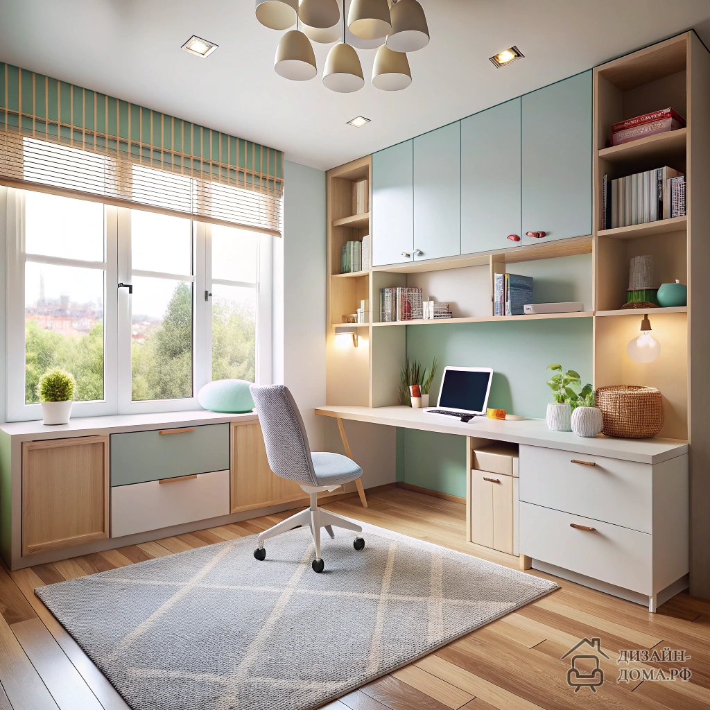 На этом фото бросается в глаза не яркость, а грамотное зонирование на три ключевых участка: рабочее место у окна (где больше всего естественного света), шкафы для хранения вдоль стены (без выступающих ручек — ничего не будет травмировать), уютная игровая зона с ковром и креслом. Цвета — пастельные и расслабляющие, а места для хранения интегрированы в корпусные элементы, так что комната ощущается целостной, а не перегруженной. Акцентный ковёр становится островком для игр и чилла.