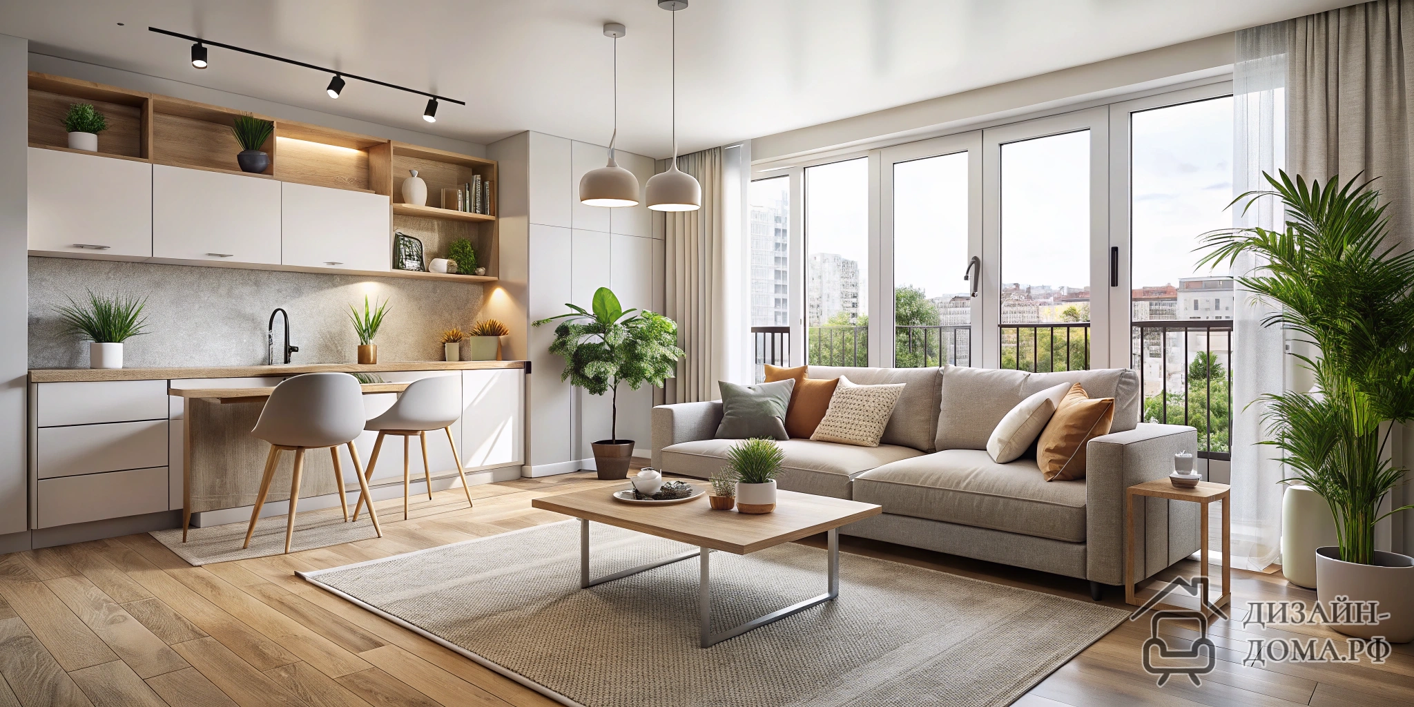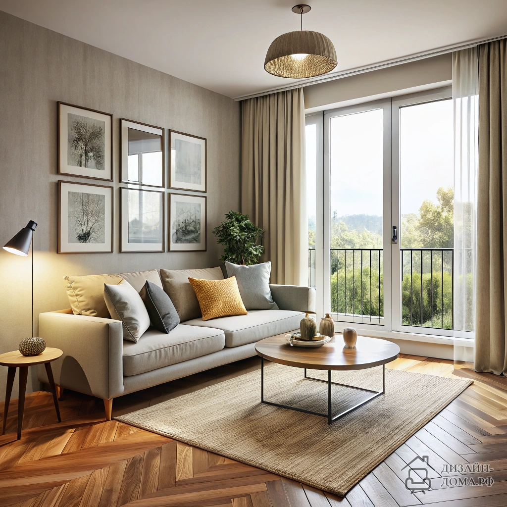 Что первым делом ловит взгляд на фото гостиной? Не просто светлый диван у окна, а ощущение двойного света за счёт балкона. Дизайнер тут сделал хитрый ход: разместил диван на низких ножках так, что он смотрится лёгким даже на ограниченной площади. Балкон визуально втянут в зону отдыха — шторы из тонкого льна переходят с основного окна на выход на балкон, объединяя пространства. Паркетная доска идёт без порога, усиливая единство. Журнальный стол минималистичен, а крупная горизонтальная картина над диваном поддерживает ощущение протяжённости помещения. Настенные светильники дают мягкий тёплый свет по вечерам и не загромождают потолок.