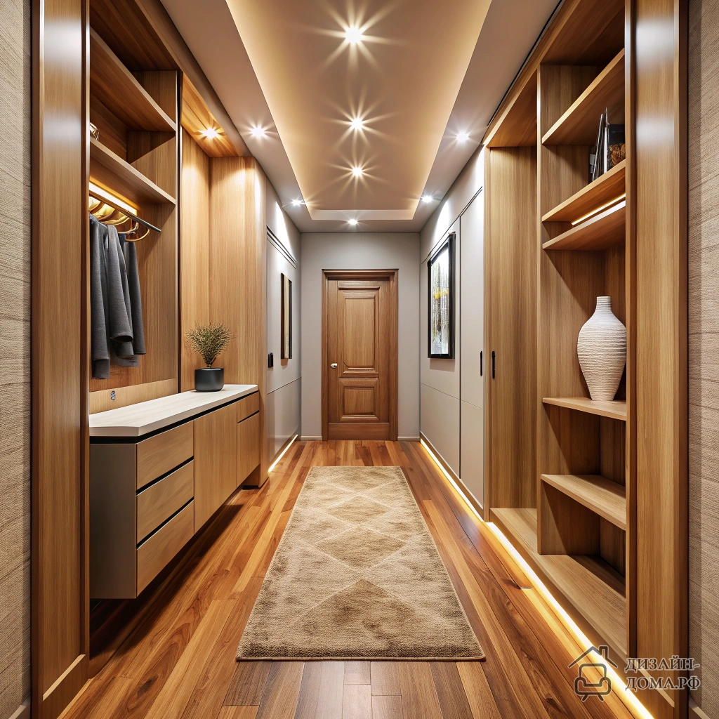 На фото видно, как авторы интерьера выбрали длинную ковровую дорожку, чтобы разбить монотонность узкого пространства и сделать его уютнее. Ламинат в тёплых тонах не усиливает ощущение холода уличного воздуха, а бра на стенах дают мягкий рассеянный свет, не создавая «прожекторов» и жёстких теней. Зеркало в лаконичной раме визуально удваивает световую дорожку и делает коридор шире. Компактные шкафчики и система крючков позволяют спрятать одежду, не превращая коридор в чулан.