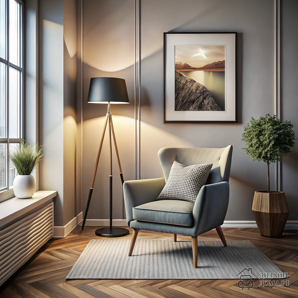 Инструмент номер один — фото удачных интерьеров. Здесь видно, как лаконичный уголок — кресло, торшер, картина — становится учебником по сочетанию цветовых пятен, текстур и пропорций. Качество снимка даёт возможность рассмотреть детали: переплетение ткани на кресле, отблеск латунного цоколя торшера, глубину белого на холсте. Нельзя недооценивать эффект качественного фото — именно так рождаются идеи для своих будущих проектов.