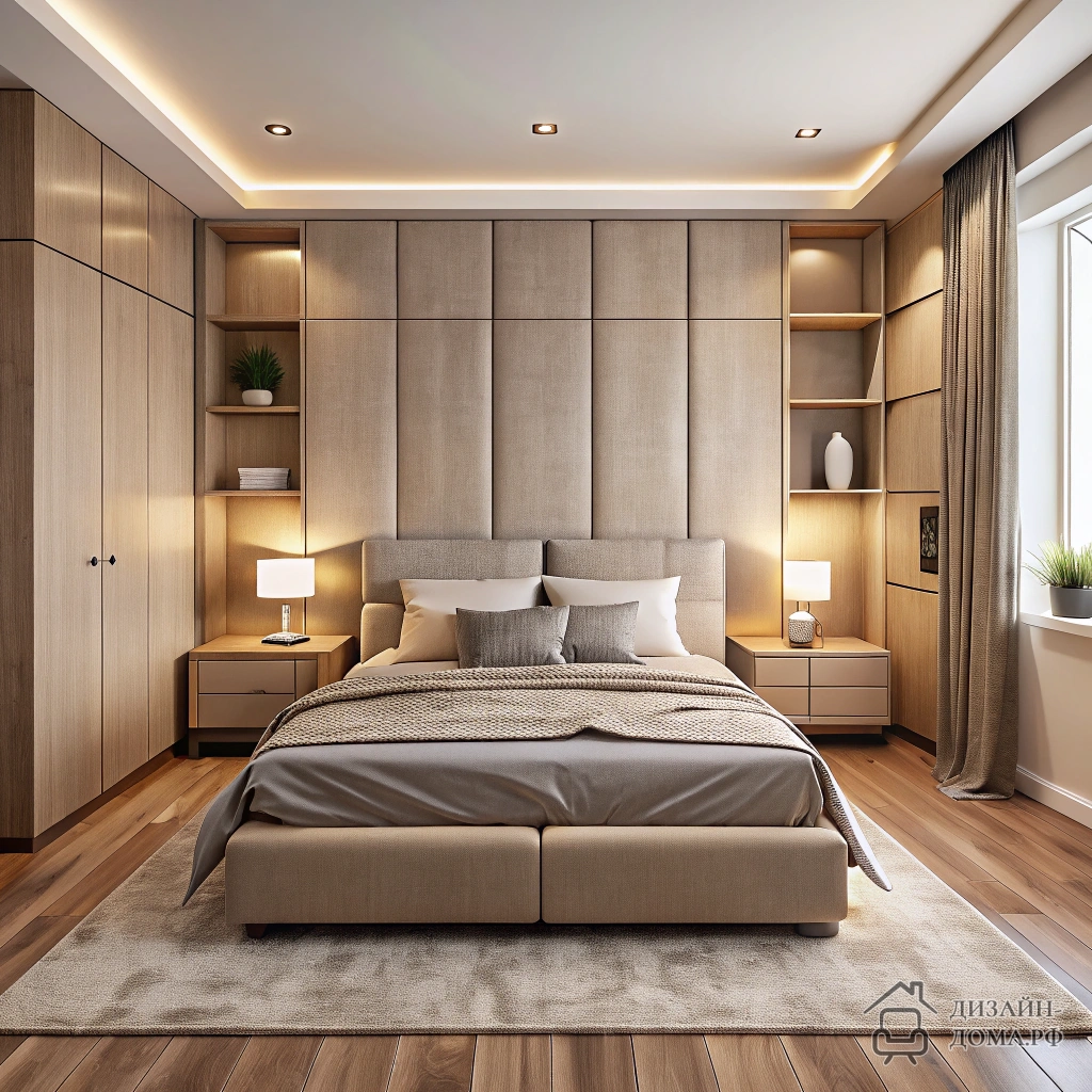 Здесь использован классический приём: крупная кровать с выразительным изголовьем по центру и две лаконичные тумбы, которые задают симметрию. Деревянный пол с крупным рисунком — не только тёплая текстура, но и «проводник» для света из окна. Платяной шкаф с раздвижными фасадами не крадёт сантиметры, а расцветка текстиля (бежево-серые оттенки) работает на ощущение объёма и спокойствия. Мягкое освещение даёт равномерный тёплый фон — спальня словно обнимает светом.