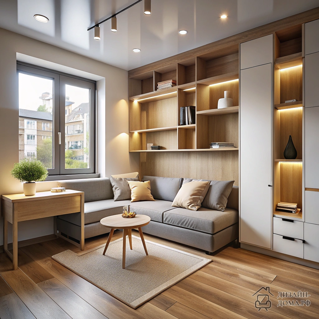 Перед авторами стояла жёсткая задача: как в одной комнате разместить сразу зону сна, мини-кабинет и систему хранения так, чтобы не было ощущения тесноты? Взгляните на стратегию: диван-кровать с нейтральной обивкой работает с утра до ночи, а складной стол у окна исчезает, когда не нужен. Встроенный шкаф «уходит» в угол, а открытые полки тянутся по всей длине стены, визуально раздвигая границы комнаты. Светлый тёплый пол из дерева плюс точечные светильники делают интерьер уютным даже в дождливый день.