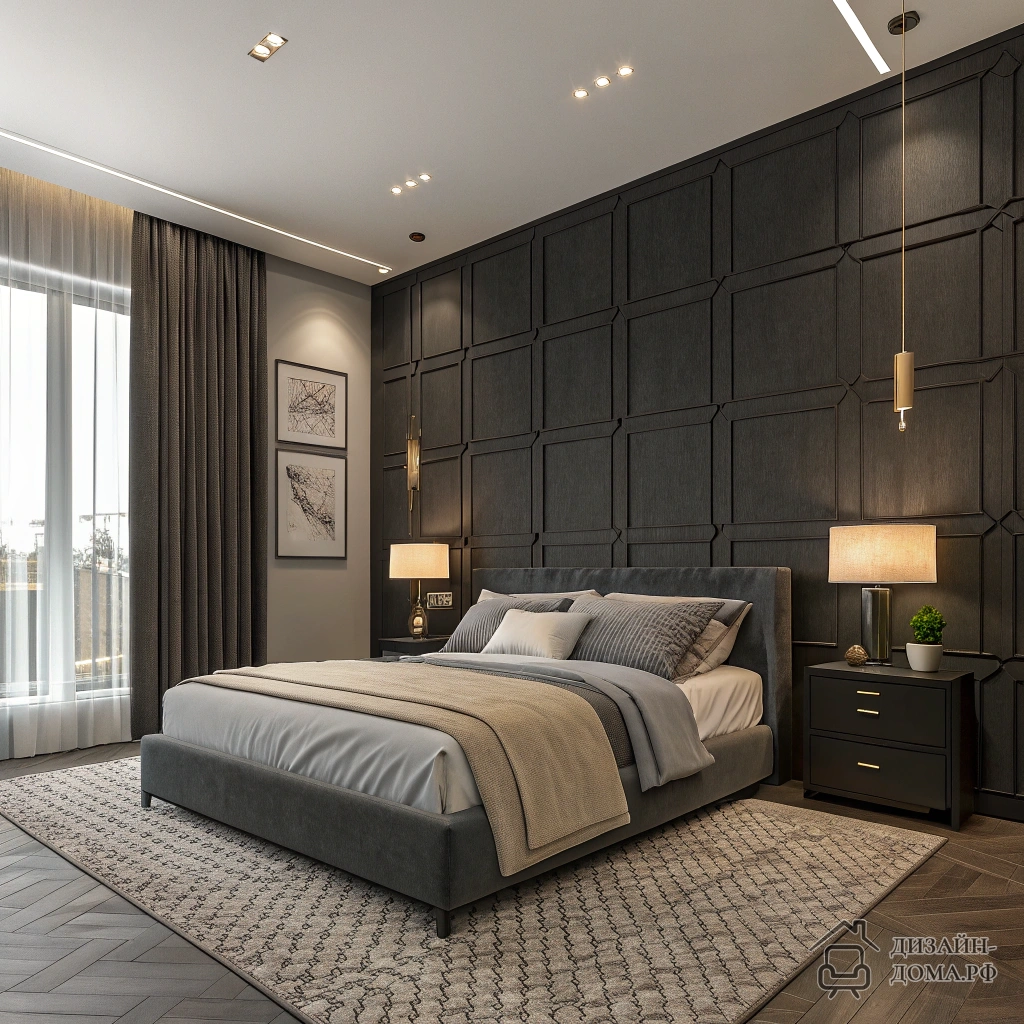 Правило контраста с нюансом: глубокий графит в квадратной спальне не крадет свет, если его поддержать светлым текстилем и локальным освещением. В проекте на фото выбран выразительный матовый графит для одной стены. Она сочетает в себе энергию и спокойствие: кровать с нейтральным серо-бежевым текстилем, низкие тумбы, две отдельные лампы для мягкого сценария. Дизайнер добавил крупный текстурный ковер, за счет чего помещение не кажется холодным. На стенах — лаконичные черные декоративные рейки и минималистичные постеры.