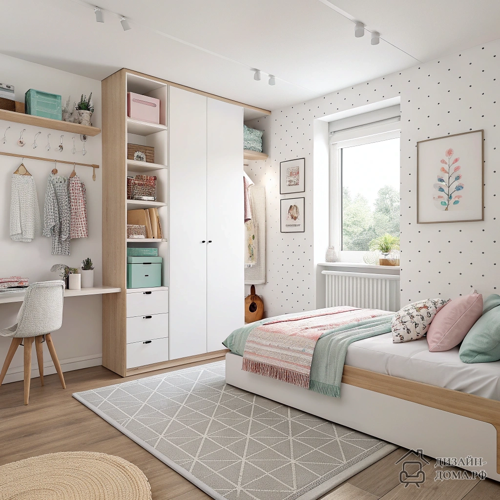 Правило: если форма комнаты не идеальна или у вас длинная стена с нишей, не теряйте эти метры — интегрируйте шкафы по углу, как показано в проекте с Г-образной спальней. Кровать упрятана в нишу, благодаря чему вторая часть стены превращена в вместительный стеллаж и систему хранения. Рабочий уголок встроен компактно, подсветка мягко выделяет зоны — никаких лишних перегородок.