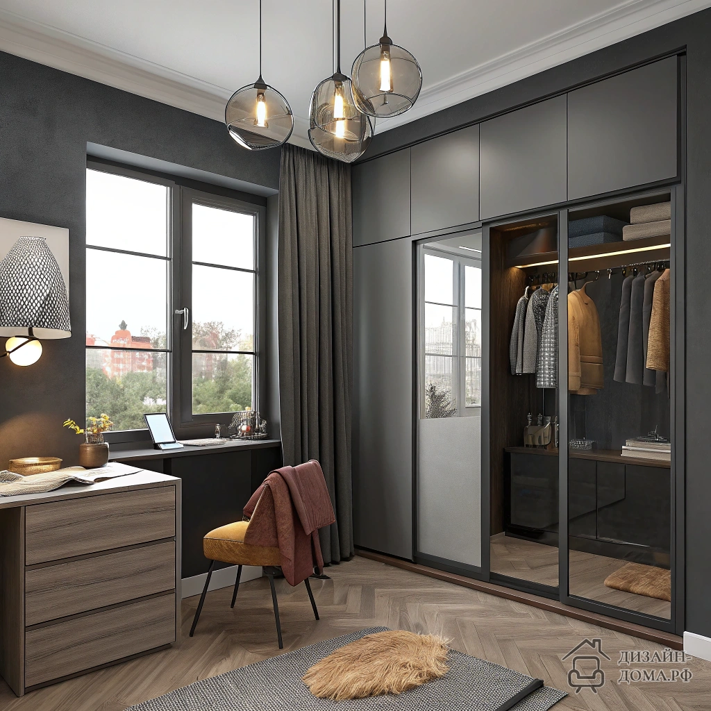Зеркальный шкаф прекрасно работает в проекте дизайн спальни 4 на 4 — даже при тёмной палитре не будет тяжести.