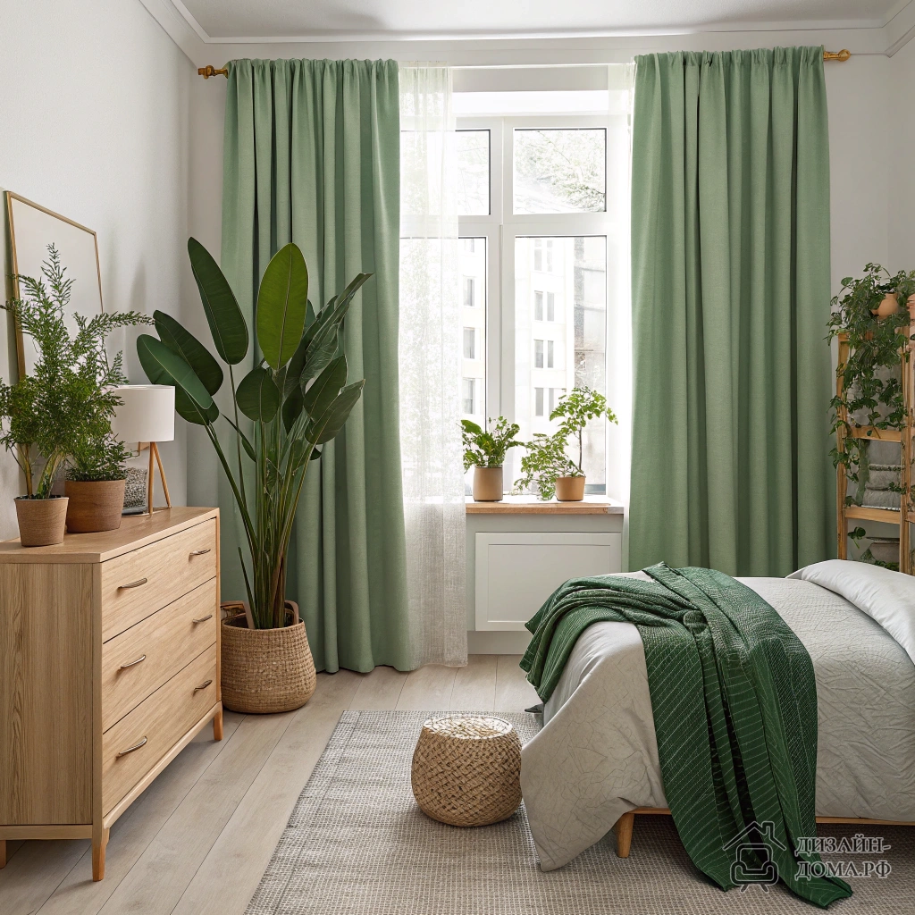 Решение: зелёные шторы + комнатные растения превращают стандартное окно в акцентную точку — работающий биофильный приём.
