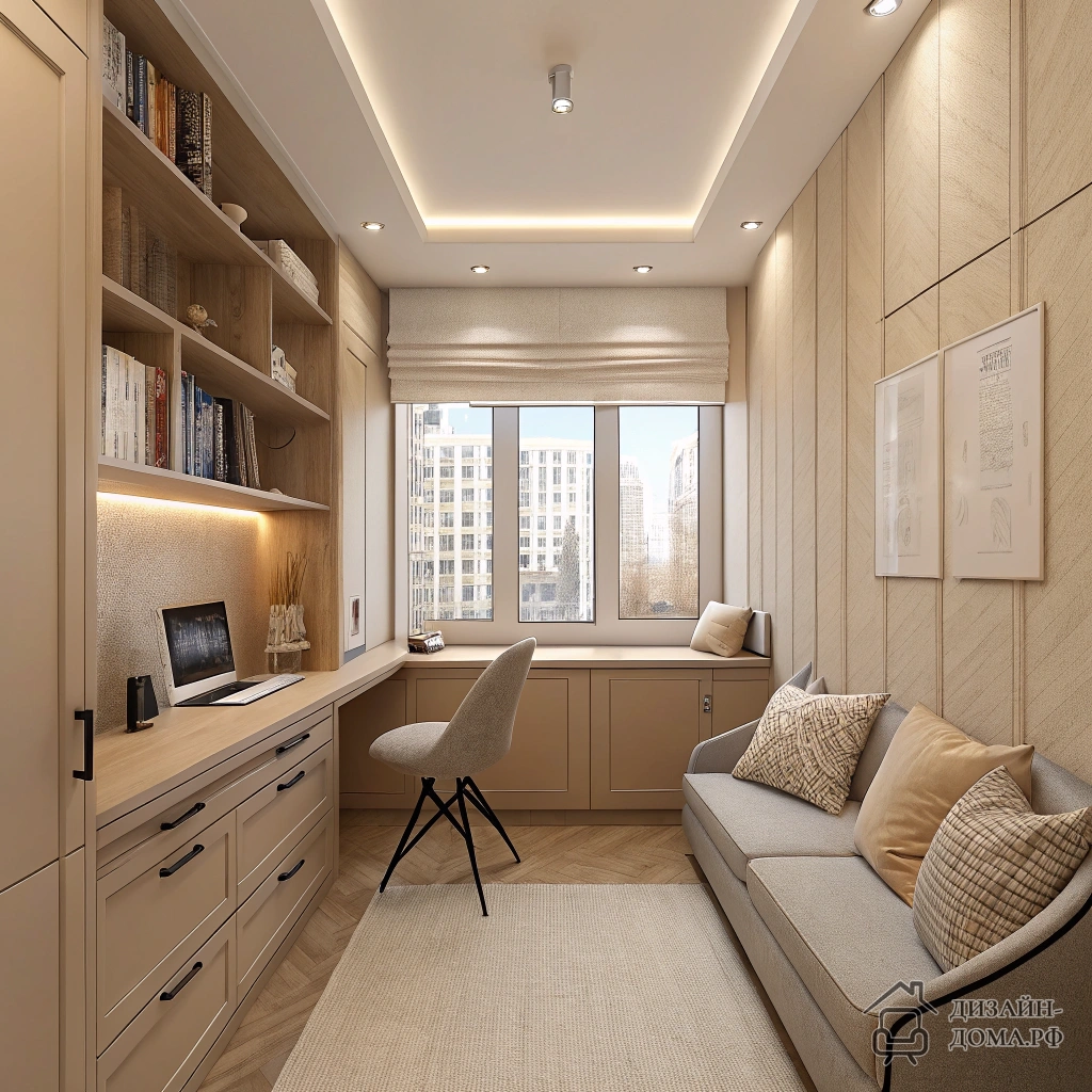 Здесь дизайнер сделал ставку на зону у окна: рабочий стол тесно примыкает к оконному проёму, а вдоль стены развёрнута компактная зона отдыха с парой кресел и низким встроенным шкафом. Кремово-молочные стены поддерживают ощущение рассеянного света даже при пасмурной погоде.