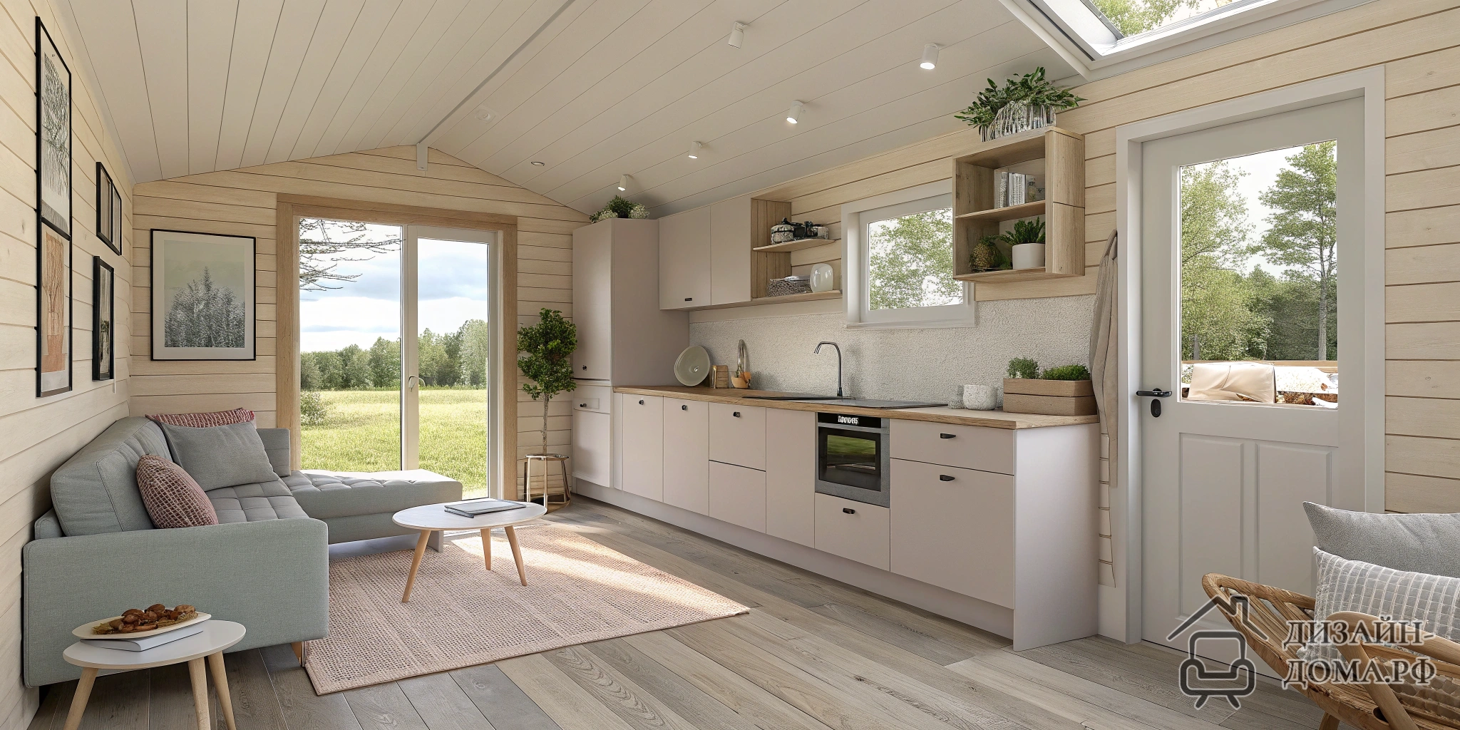 Текстильная занавесь, облегчённые стеклянные двери или нейтральная мебель — рабочие приёмы для открытой кухни‑гостиной. На проекте модульного дома видно: дизайнер использовал компактный диван, кухонную зону “в линию” и не перегружал проёмы глухими стенами. Результат — помещение “дышит”, хотя и объединяет сразу две функциональные зоны.