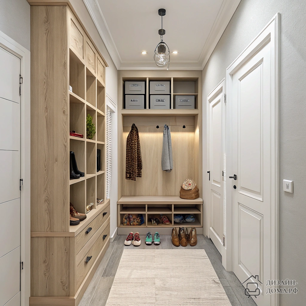 Начинайте с идеи: всё, что можно встроить, — прячьте. Дизайнер модульного дома на этом фото отказался от внешних стеллажей, добавив кладовые-ниши и полки под потолком. Узкие полки для обуви в прихожей и система вертикальных крючков абсолютно незаметны, но функциональны и не перетягивают внимание на себя.