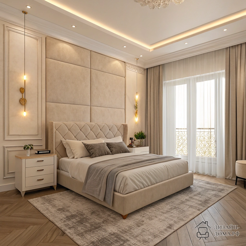 Важный нюанс: используйте несколько сценариев света — нитевидные бра, тёплую рассеянную подсветку по потолку или в нишах, и тогда в спальне всегда будет мягкая атмосфера.