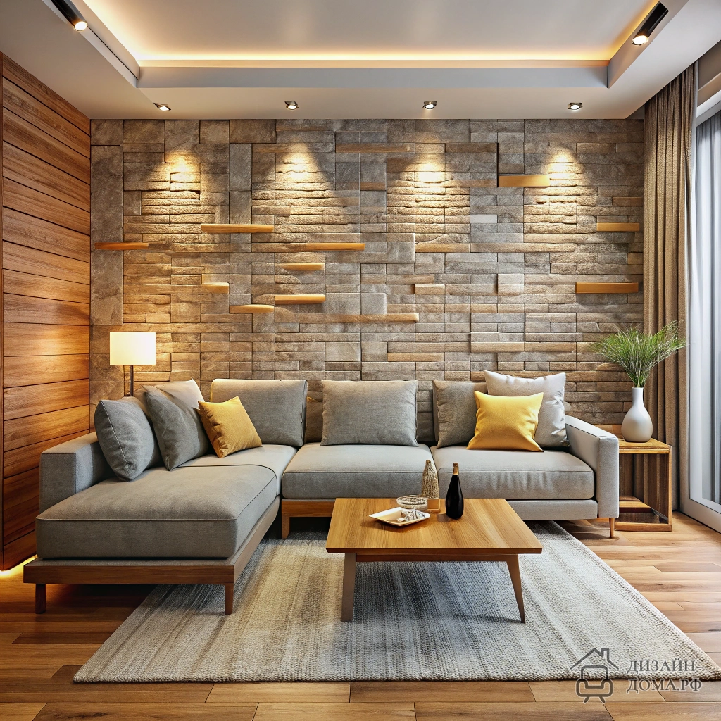 Суть приёма: натуральная фактура камня + массив дерева = пространство становится визуально теплее и камернее, несмотря на открытую планировку.