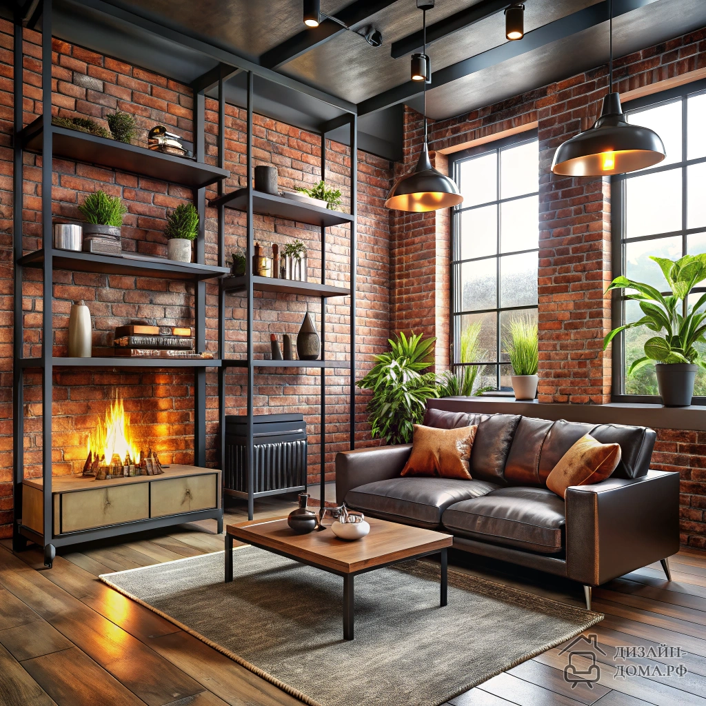 Главная находка проекта: камин в стиле лофт + открытые полки и металл создают одновременно ощущение уюта и простора.