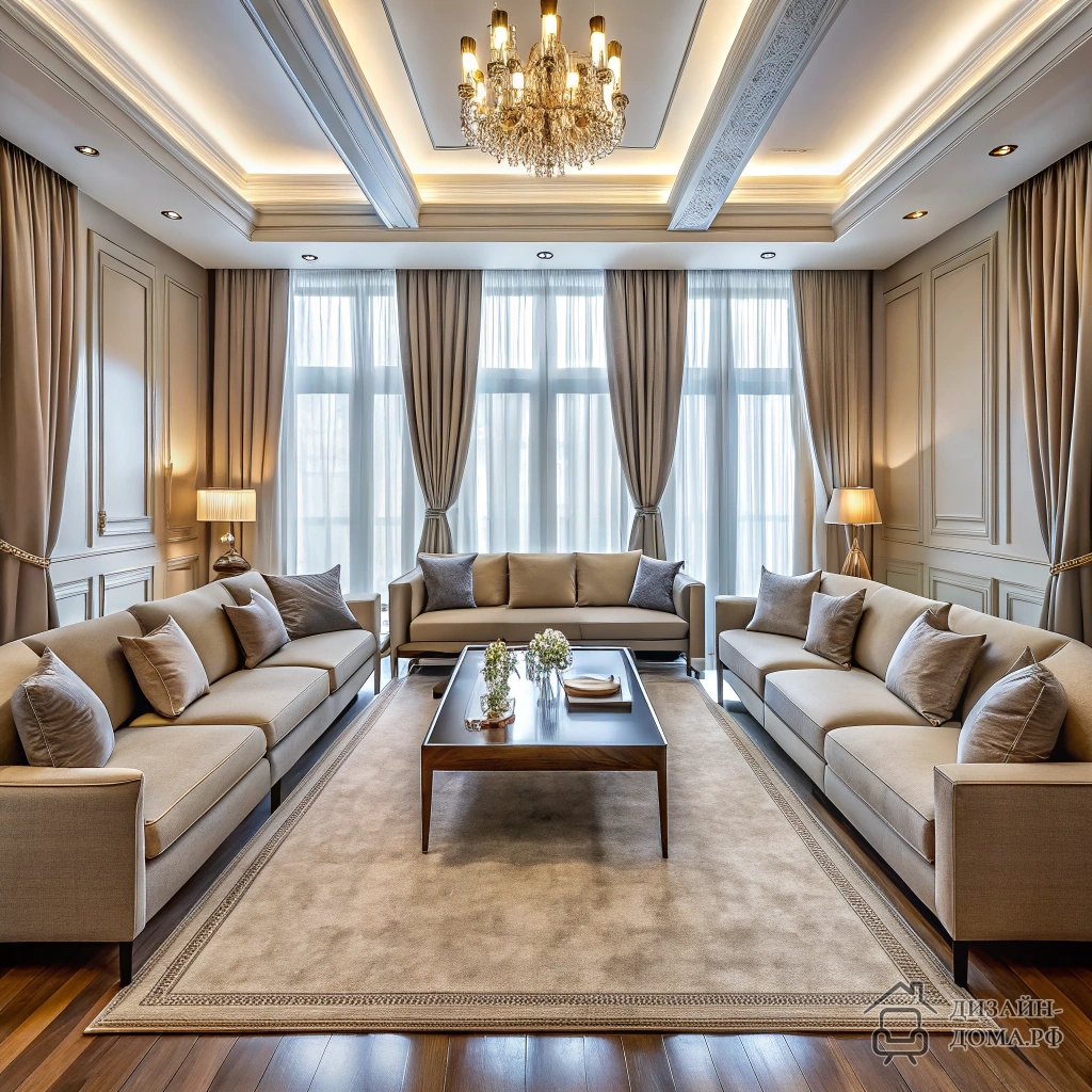 Что отличает зал с четырьмя окнами? Здесь всегда есть риск превратить комнату в бесформенное светлое пятно. Дизайнер в проекте нейтрализует этот эффект симметричным расположением мебели: два дивана и кресла делят помещение на понятные зоны, а графитовые шторы корректируют светопоток, не затемняя комнату. Центральный ковёр собирает композицию, а декоративные детали расположены только там, где нужен визуальный стоп.