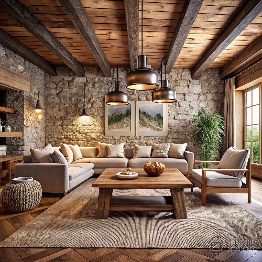 - Трансформировать зал в рустик: использовать балки и камень как «согревающий» каркас