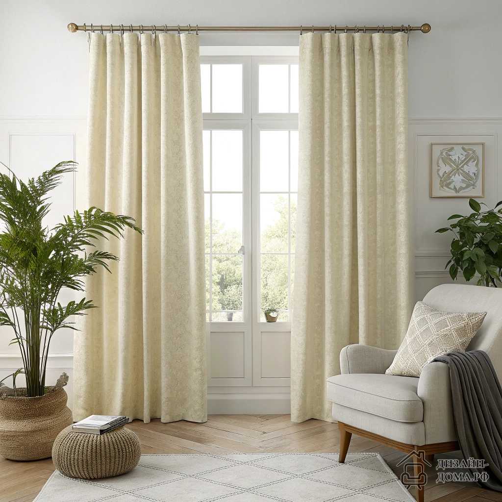Правило для больших окон: ничто так не добавляет глубины и уюта, как шторы с гобеленовым эффектом в цвет стен. На фото — наглядная демонстрация: тяжёлые, но светлые молочные портьеры (имитация гобелена) перекликаются с текстильным креслом и растениями. Мягкость тканей феноменально работает на ощущение уюта — даже без богатого декора. Плюс — в закрытом положении шторы делают комнату камерной без ощутимой потери света.
