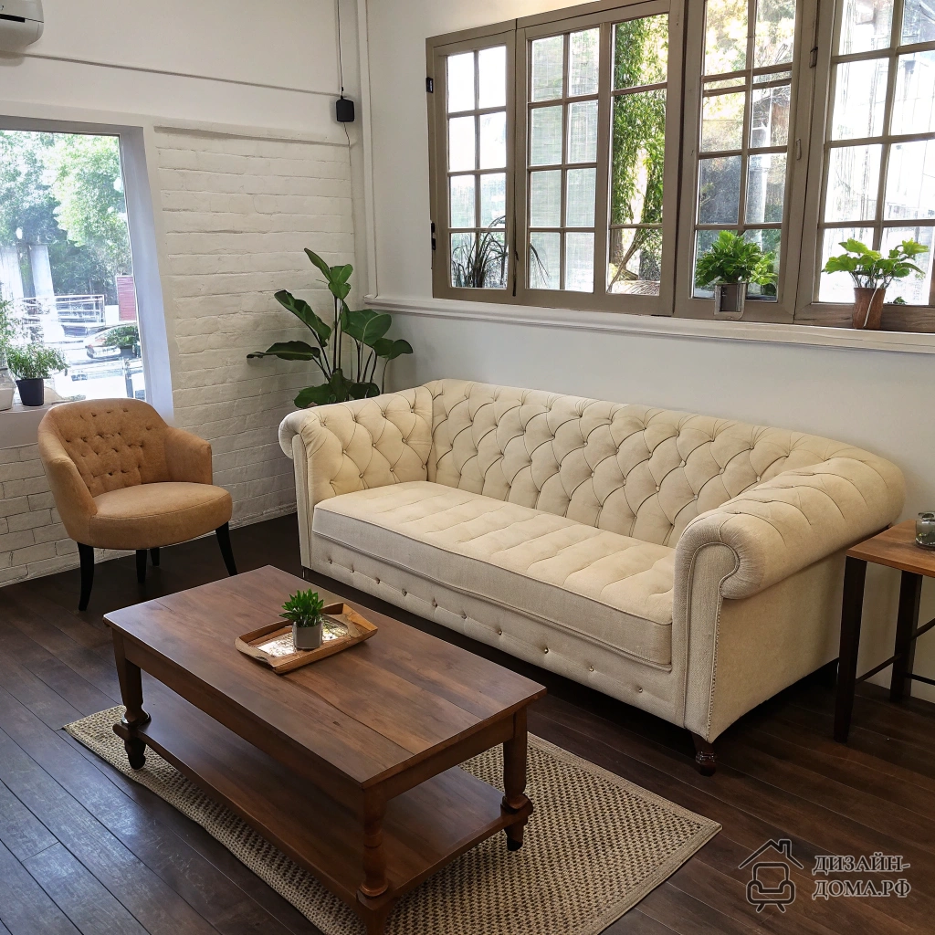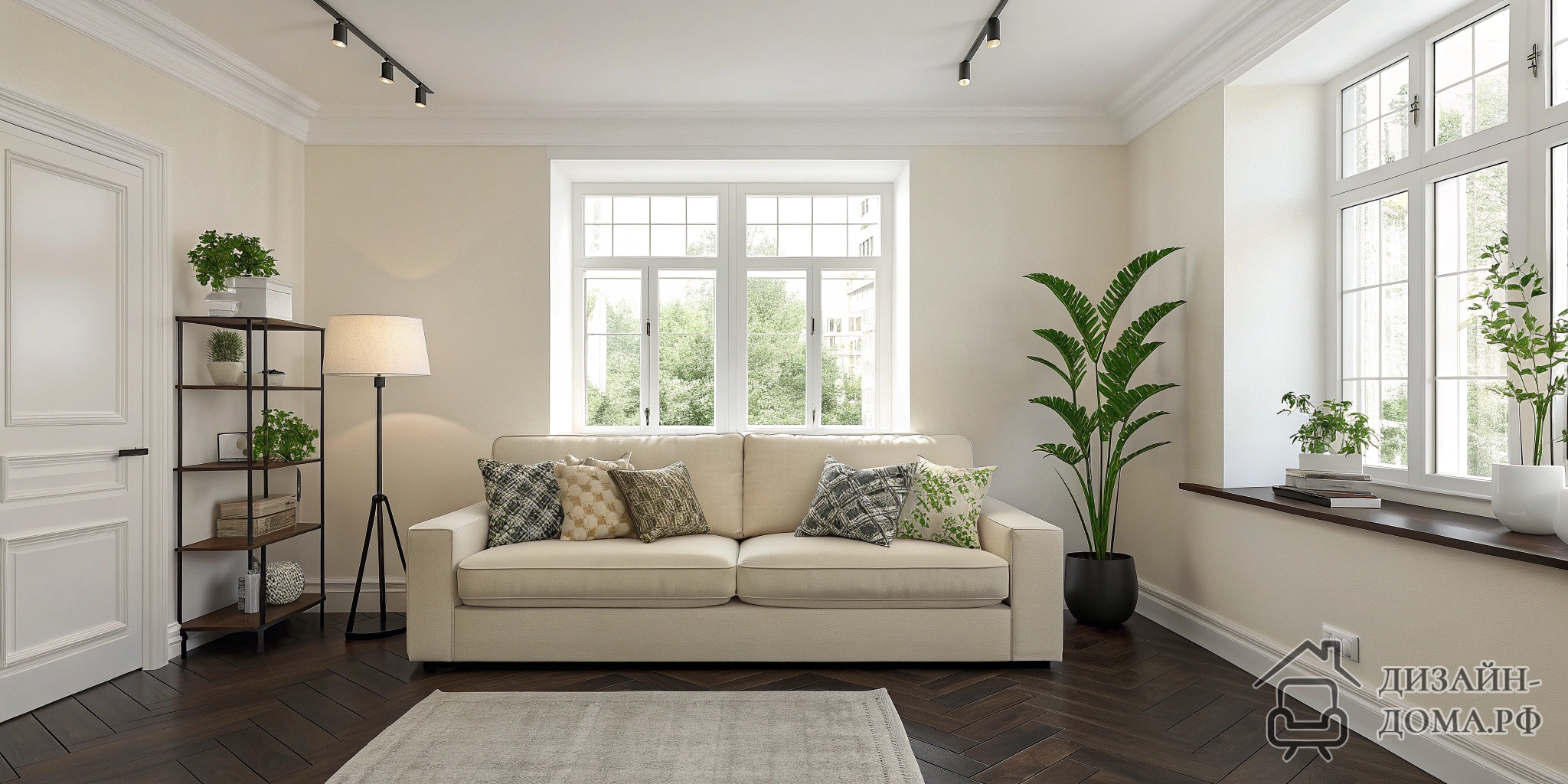 Лучший приём для гостиной: определиться с акцентным предметом и не распыляться на мелкие формы. В зоне на фото дизайнер выбрал кремовый диван внушительных размеров — без подлокотников, на низких широких ножках. Рядом — стеклянный журнальный столик на светлом дереве, одно кресло в нежной обивке и зелёные растения. Молочный тон стен повторяется в шторах — но они исчезают на фоне общей гаммы, не дробят объём. И вот что важно: темно-коричневый пол в интерьере не «тянет» вниз, а работает как уверенный контраст для всей палитры. Помогают и детали — аккуратный подоконник без ушей превращает углы в чистые линии и поддерживает идею лёгкости. Такой приём прокачает и небольшую комнату: в любом пространстве важно избежать захламления за счёт выбора более крупных, но простых по форме предметов.