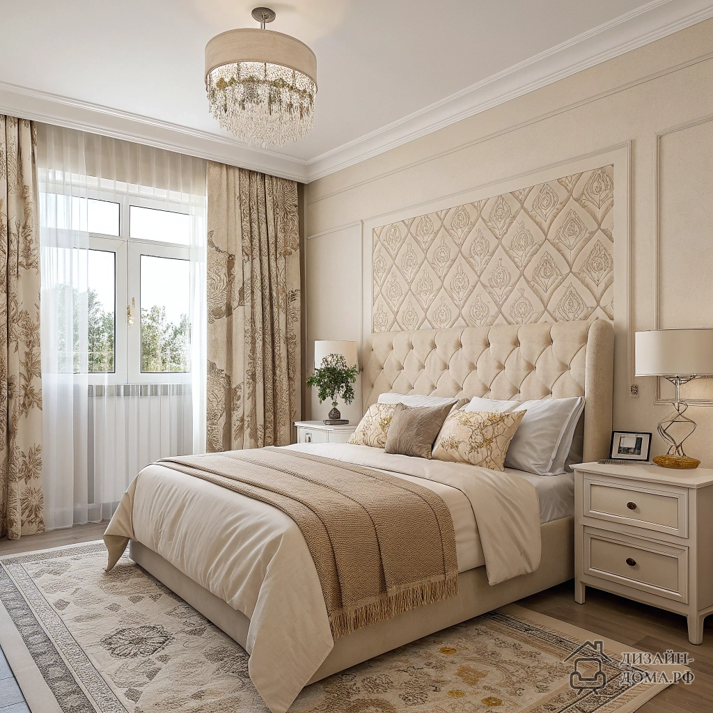 Правило для спальни: текстиль задаёт атмосферу. Плотные, тактильные шторы с гобеленовым эффектом работают «со светом» иначе, чем простые хлопковые занавески: они поглощают лишний дневной блеск, добавляют уюта и при этом не забирают ощущение простора. Это видно в спальне на фото — кремовое изголовье кровати, спокойный декор на тумбочках, а главное — плотные, но не тяжёлые шторы. Молочная палитра кажется ещё теплее, а текстура сразу намекает на более дорогой интерьер. Такой подход отлично поддержит минимализм и даже сканди — баланс между строгостью и тактильным уютом здесь заложен изначально.
