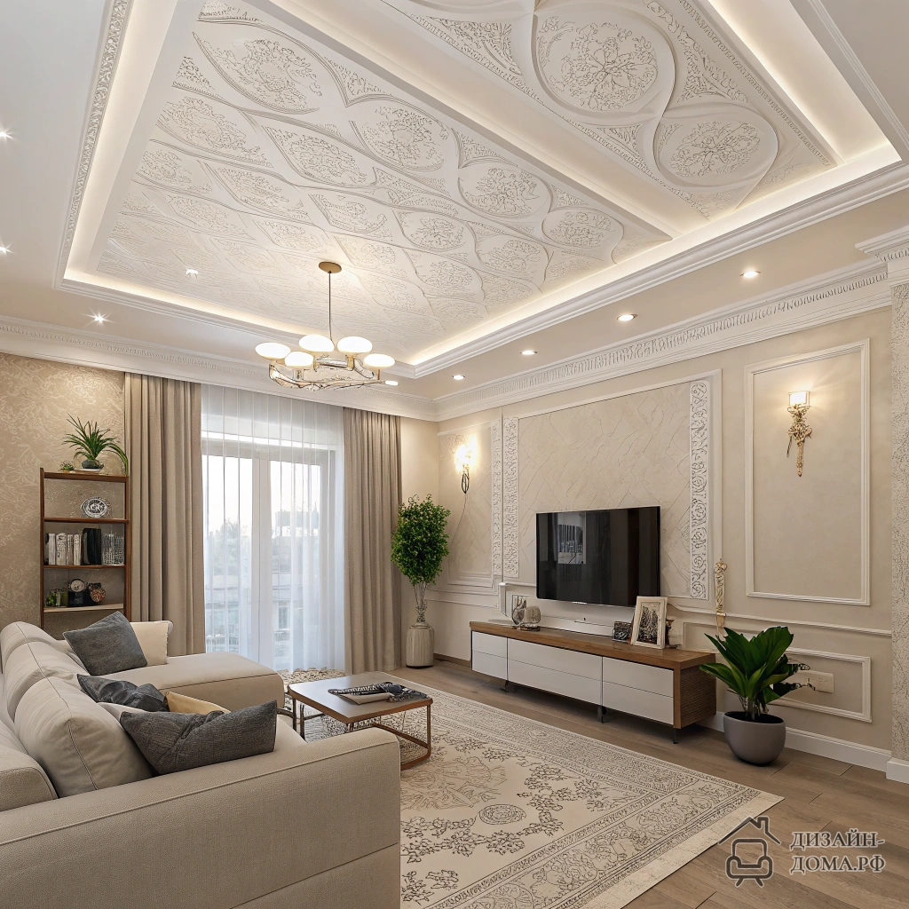 Акцентный элемент сверху? Почему бы и нет! В проекте гостиной дизайнер решился на микролепнину — очень тонкую, почти невидимую, она не дробит плоскость потолка, а обрамляет пространство, словно лёгкая рамка. Плюс — лёгкие декоративные балки и встроенный мягкий свет. Финальный эффект: потолок не давит, при этом сразу выделяет комнату среди тысячи стандартных проектов. Если не хочется классики — рассмотрите современный декор потолка со скрытыми карнизами, треками и нишами под подсветку, он работает на «возвышение» всей зоны.