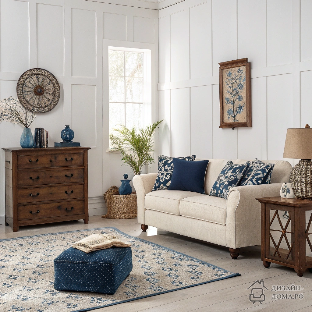 Молочный интерьер не равен скуке. Добавьте акцент: пара аксессуаров насыщенного цвета сразу проявит характер отдельной зоны. На коллаже — глубокий синий вазон, тёмно-коричневый пол и невесомые молочные стены. Такой подход спасает и минимализм, и современную классику: акцентные подушки, картины, текстиль в выбранных RAL-оттенках, керамика необычной формы. Важно не переборщить: достаточно 2–3 оттенков-акцентов в небольшой комнате. Каждый акцент как бы «погружается» в сливочную базу и работает как выразительный мазок на чистом холсте.
