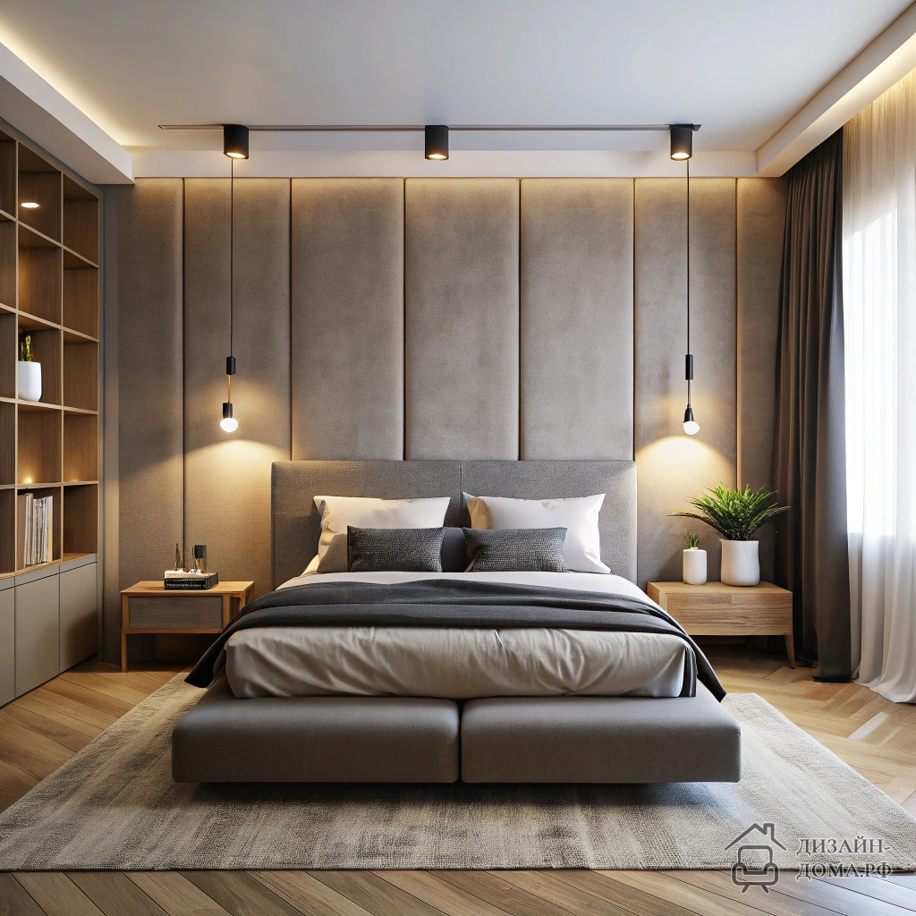 Что первое цепляет взгляд на фотографии спальни 3×4? Контраст: глубокое графитовое изголовье на фоне матово-молочных стен, минималистичные светильники по бокам, текстиль будто растворяется в мягкой гамме. Дизайнер здесь использовал метод «акцентного якоря»: тёмная кровать определяет центр композиции, в то время как остальное пространство «разбавлено» светом. Молочные поверхности отражают свет, а графитовый цвет кровати добавляет глубину и объём, не перегружая комнату. Обратите внимание, насколько облегчена мебель: тумбочки на тонких ножках, отсутствие лишнего декора, только тактильные подушки и лёгкое одеяло.