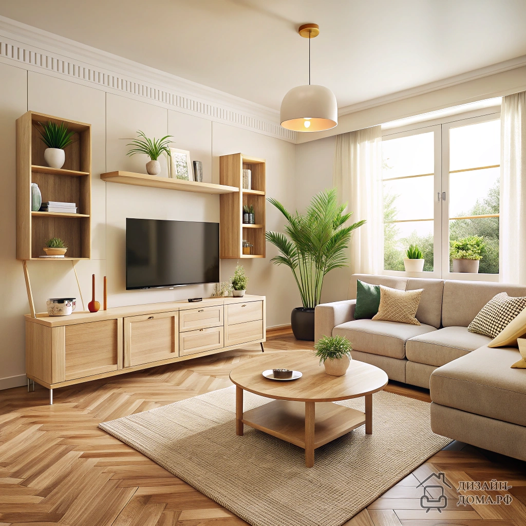 В маленькой гостиной часто возникает проблема: куда деть хранение, чтобы не «пережать» пространство? Здесь дизайнер выбрал шкаф-лавку из светлого дерева, поставив его вдоль стены под телевизором. Такой приём позволяет не «резать» высоту и сохраняет ощущение воздушности — особенно если верх мебели остаётся свободным, а цвета шкафа и стен почти сливаются. Вдобавок, на шкаф можно поставить локальные акценты: керамическую вазу, пару книг, светильник.