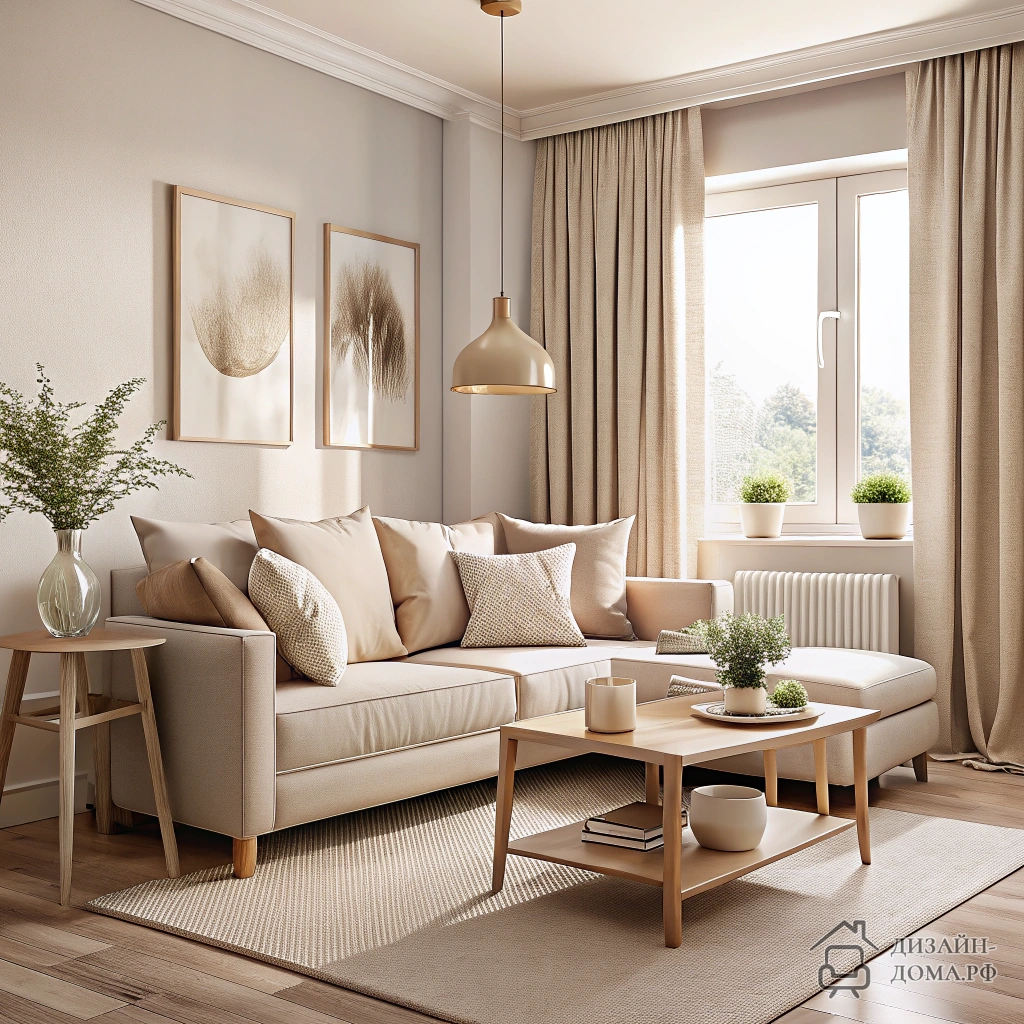 Для раскрытия палитры дизайнер не ограничился лишь мебелью или цветом стен. В композиции используются пастельно-розовые подушки, бежевые шторы, картина над диваном — это создаёт слоистость и живую многогранность цвета. Молочный цвет сочетается с оттенком топлёного молока, давая эффект дополнительного света даже в пасмурную погоду.