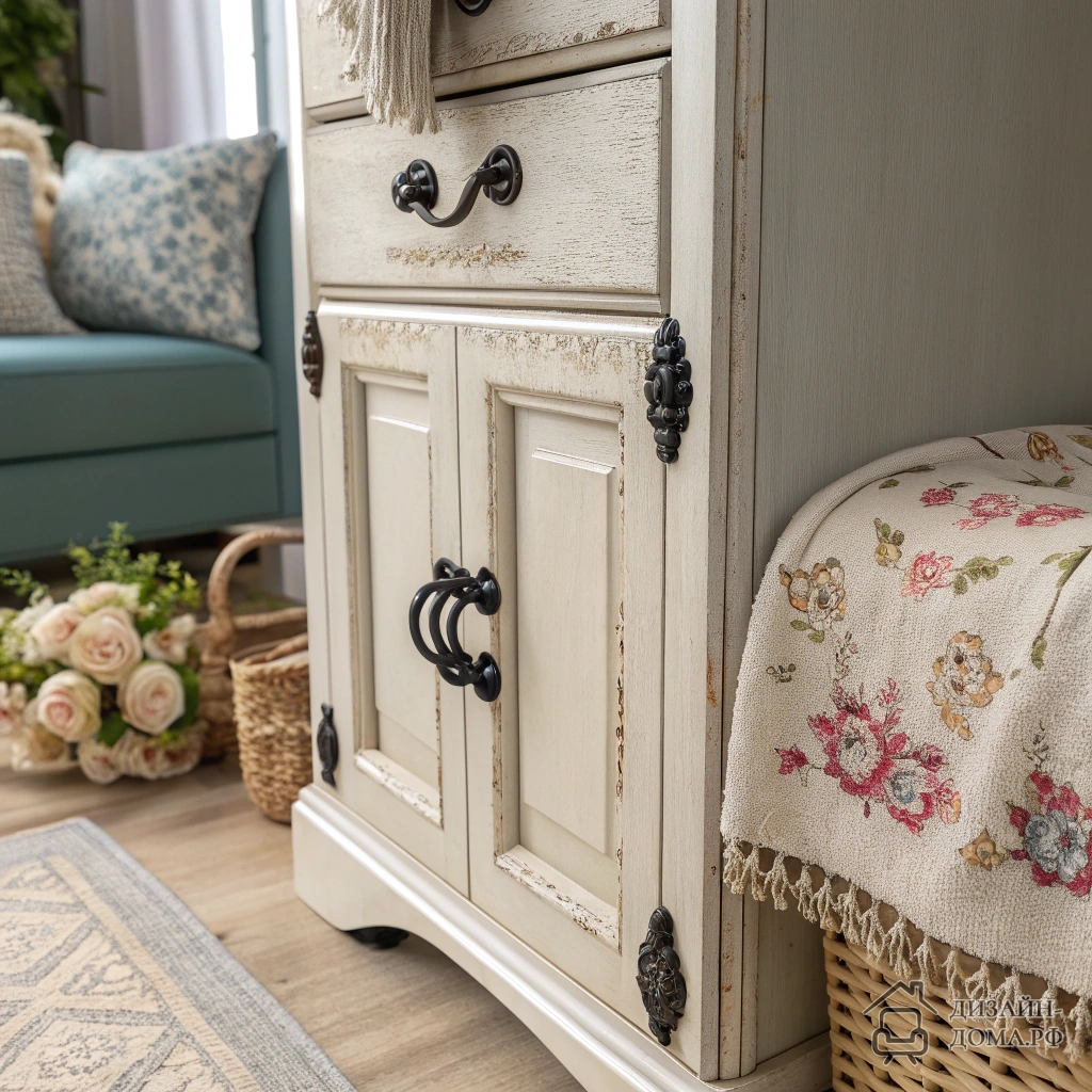 Как заставить прованс ожить в эпоху нейтральных интерьеров? На фото — акцент чистого дизайнерского мышления: светлая состаренная мебель и матовые чёрные ручки на фасадах. Они не спорят с общим стилем, а подчёркивают рукотворность, делая даже самую бюджетную тумбу предметом гордости. Текстиль рядом смягчает этот резкий акцент, а соседство цветочных аксессуаров превращает ручки в детали, которые хочется касаться.