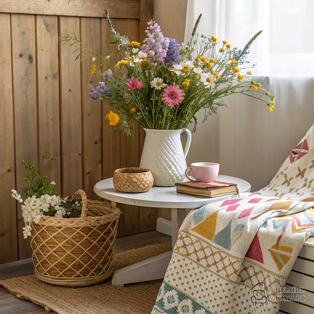 На этой фотографии сцена будто из журнала о slow living: ваза с полевыми цветами, плетёная корзина, керамика, нейтральный текстиль и деревянный фон. Дизайнер собрал не разрозненные вещи, а каталог ощущений — декор кажется «случайным», но на деле за каждым предметом стоит история. Такой подход экономит бюджет, но требует вкуса: ваза необязательно дорогая, главное — правильный характер и сочетание. Этот инструмент работает только при точном дозировании цвета и фактуры: максимум два активных пятна, остальное подыгрывает теплу дерева и текстилю.