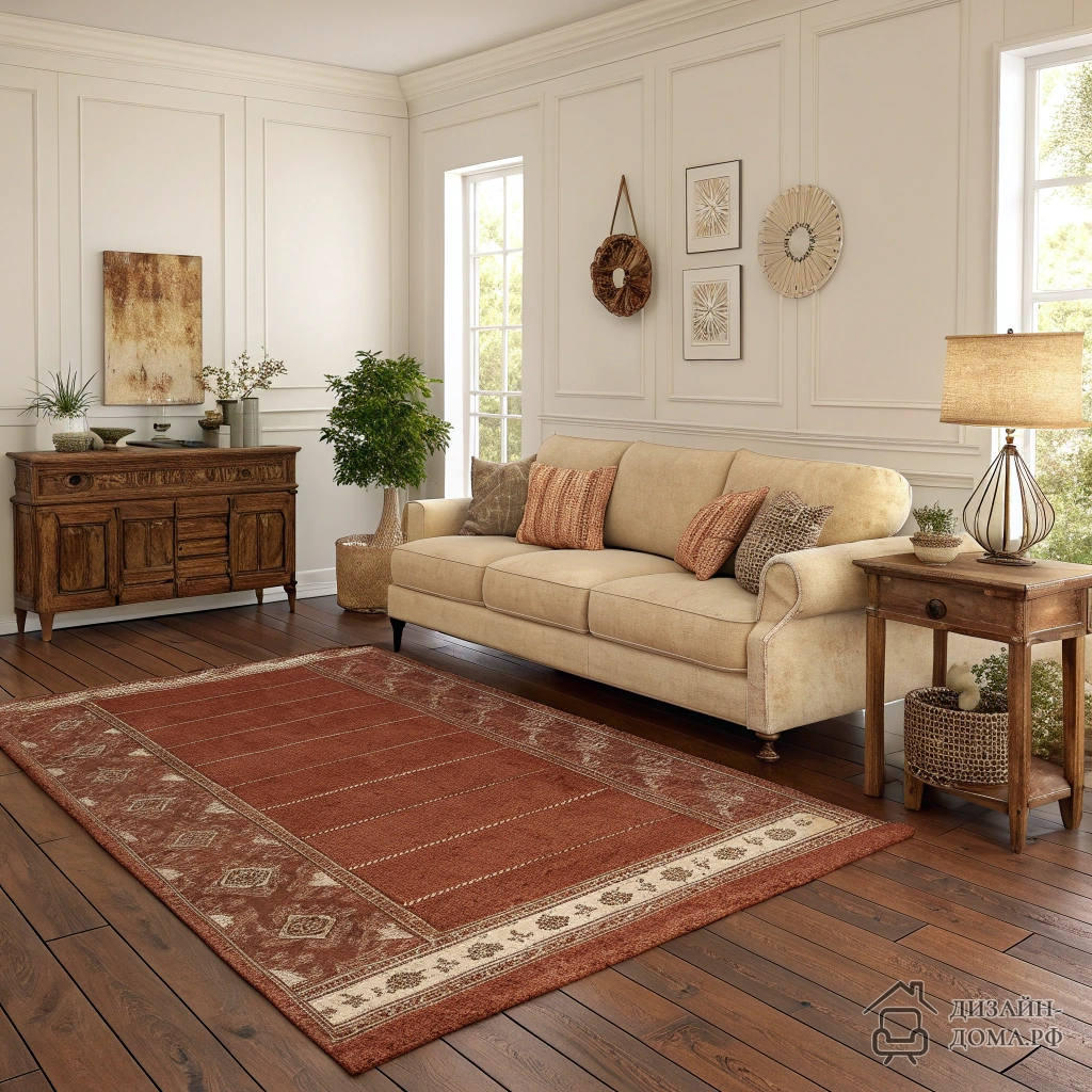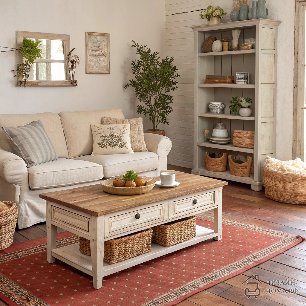 Что первым делом цепляет внимание на фото? Не просто свет, а насыщенный рыжий деревянный пол, который буквально собирает весь зал в единое уютное поле. В этом проекте дизайнер оттолкнулся не от стен, а от пола: пол выбрали с выразительной древесной текстурой и лёгкой патиной. Далее контрастом стали светлые кремовые стены и текстиль, которые не «задавили» базу, а усилили тепло покрытия. Реализация приёма: бежевый диван, текстурированные ковры, состаренная мебель, живой декор. Этот ход снял сразу две проблемы: во-первых, «тёплый пол» визуально и реально согрел довольно светлую, почти воздушную комнату. Во-вторых, богатая фактура пола вытянула на себя внимание — все остальные предметы уравновесили интерьер. Секрет работы: соблюдена палитра «одного яркого». Только пол — активный, все остальные объекты в зале прованс будто служат сценой для его раскрытия.